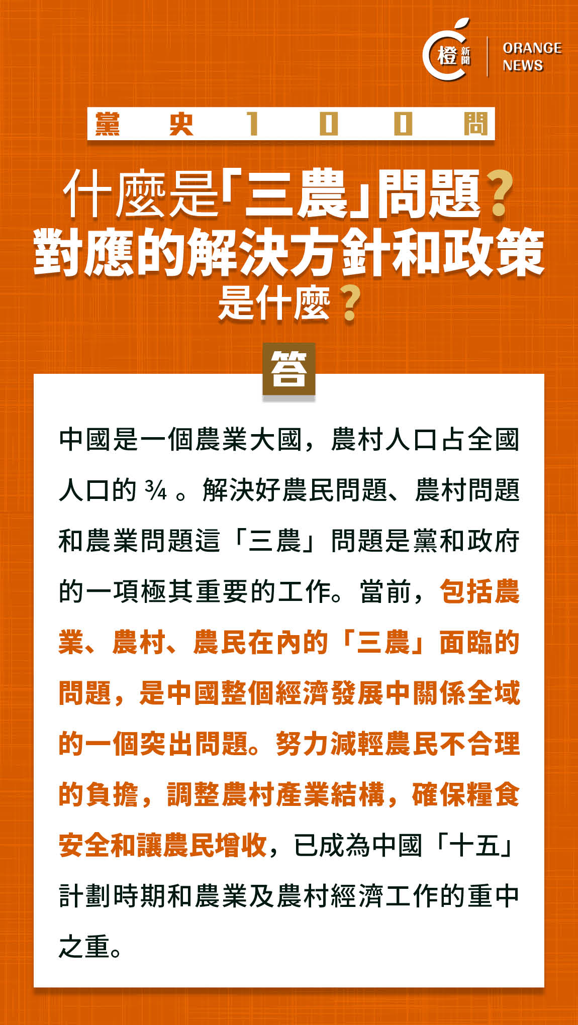 【橙訊】為熱烈慶祝中國共產黨成立100周年,《橙新聞》專門開設「黨史100問」欄目,以對答形式闡述中國共產黨百年歷史,讓讀者深入學習貫徹中國特色社會主義思想,加強了解國家發展。