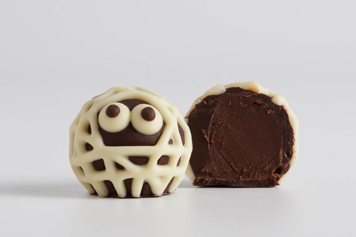 「Mr. Mummy焦糖軟心黑朱古力」($32)則有木乃伊造型的手工朱古力,黑白視覺效果對比強烈,玩味十足。