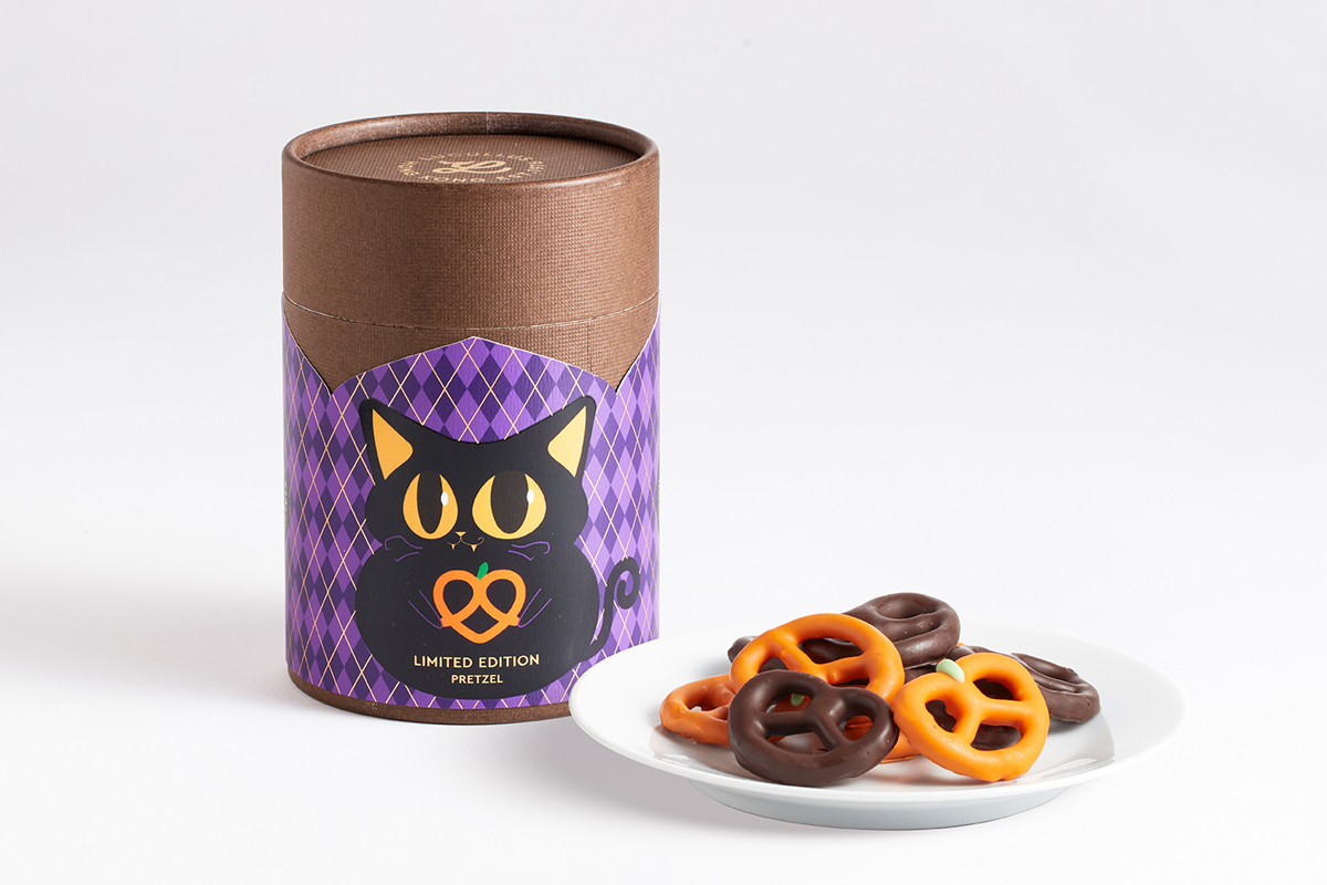 「黑貓魔法師朱古力椒鹽脆餅」($108)以神秘黑貓為主題,包裝選用圓筒形設計,別出心裁。內有兩款顏色的朱古力椒鹽脆餅,香濃的朱古力包裹傳統的椒鹽脆餅,香脆中夾雜鹹甜滋味。