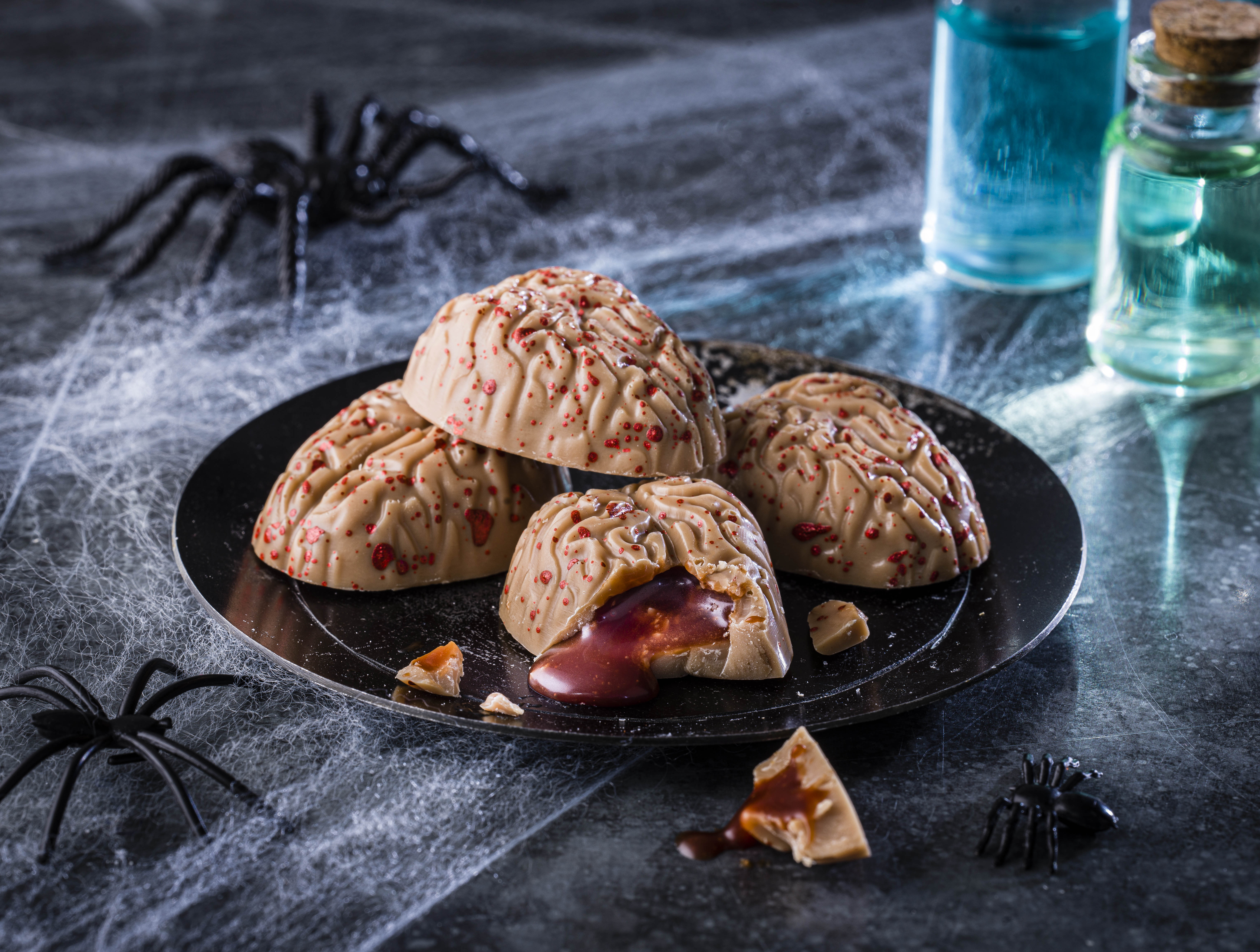 品牌特別準備多款入型入格的萬聖節朱古力及糖果,包括 : 酸甜毛毛蟲軟糖($29)、酸沙蜘蛛造型糖($16)、牛奶白鬼造型糖($16)、焦糖恐怖按鈕朱古力($49)、佈滿「血絲眼球」造型的甜奶油白朱古力($49)及血漿腦袋白朱古力($59)。