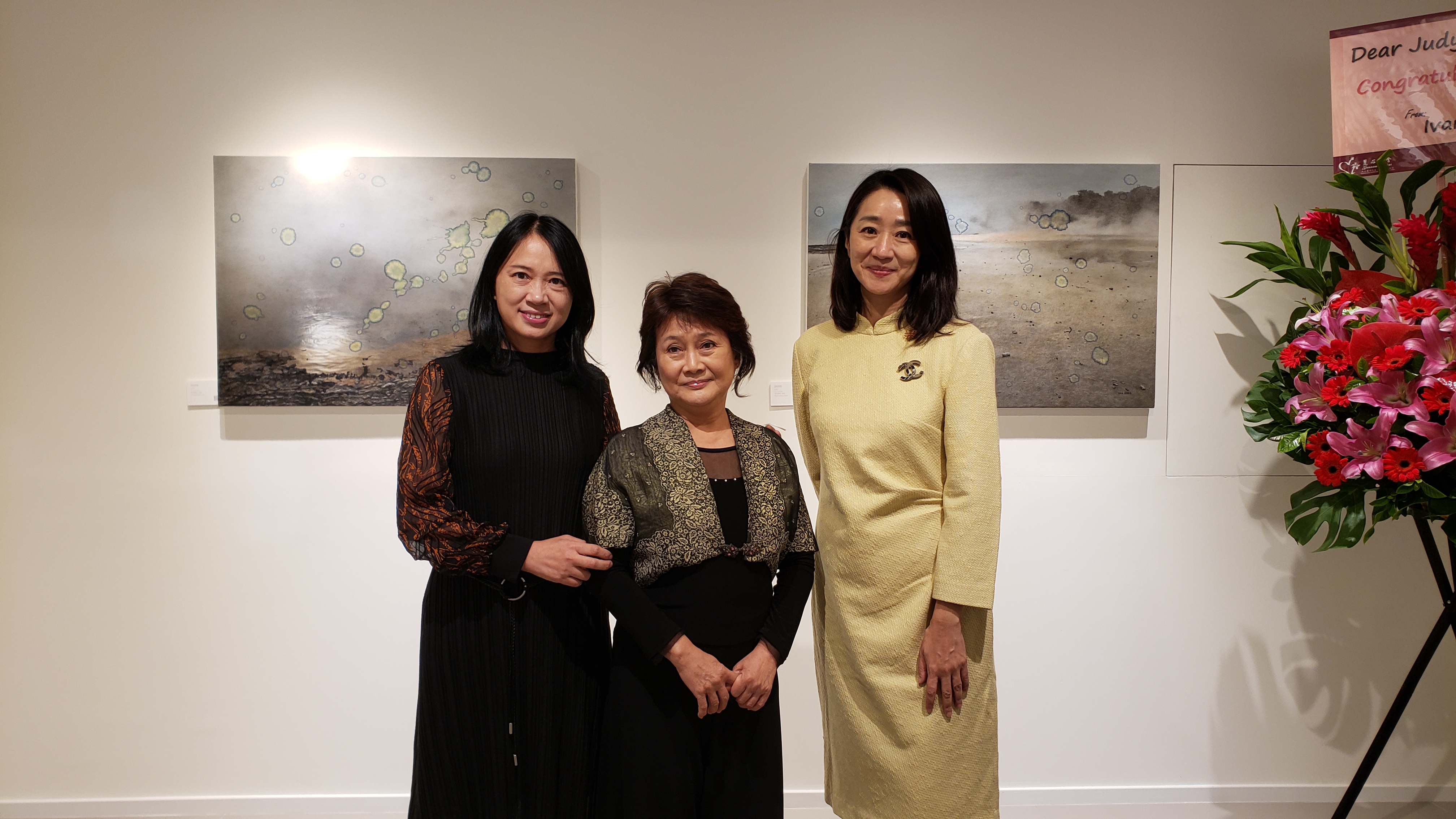 (右起)新藝潮總監邢珠迪、著名藝術家卓有瑞、新藝潮創辦人黃白露於《霧雲心迹:卓有瑞新作展》開幕儀式上合照