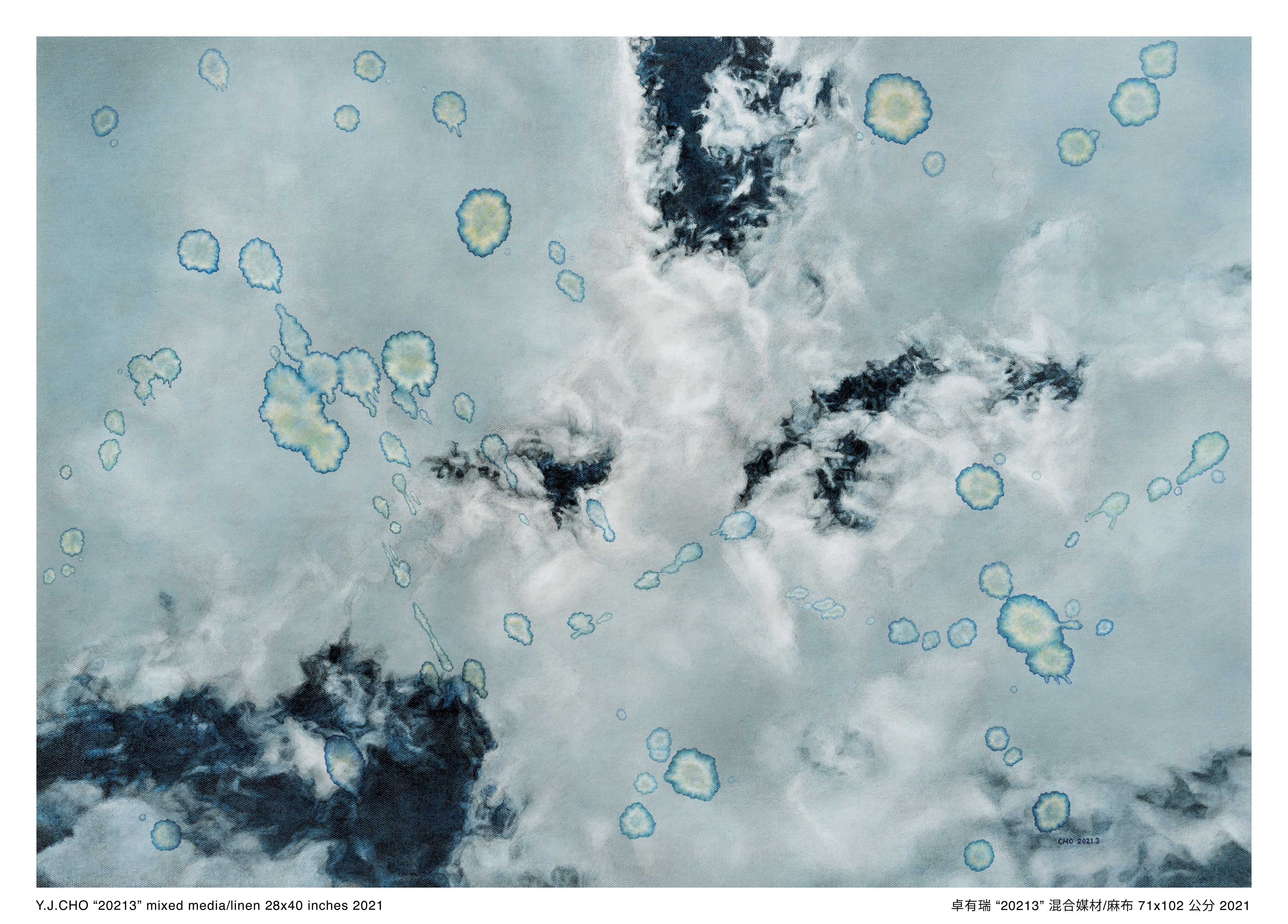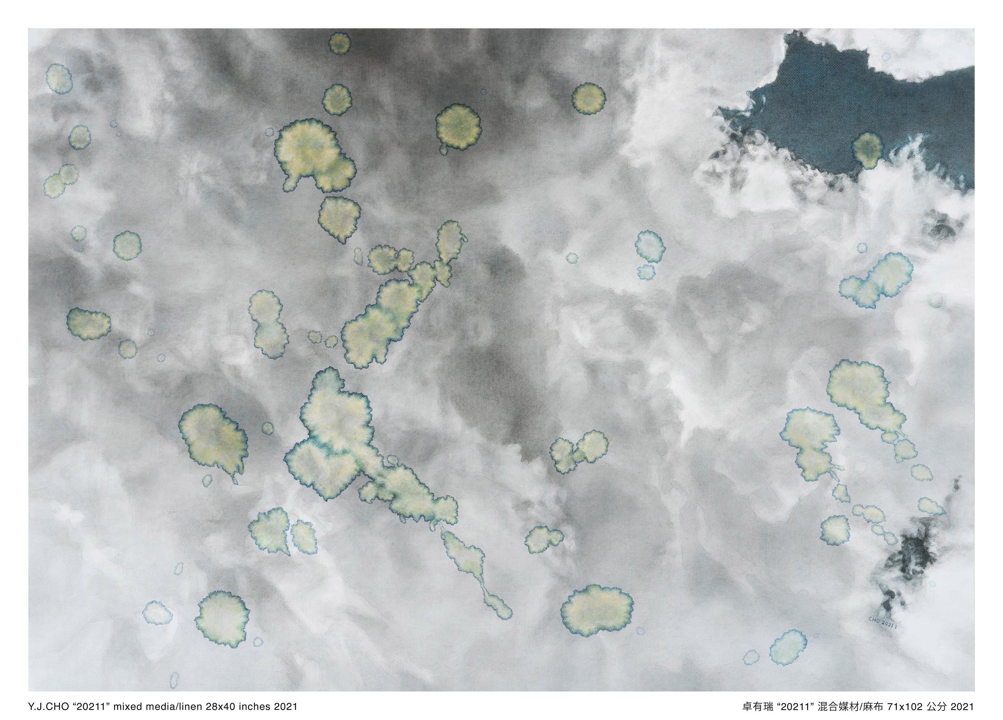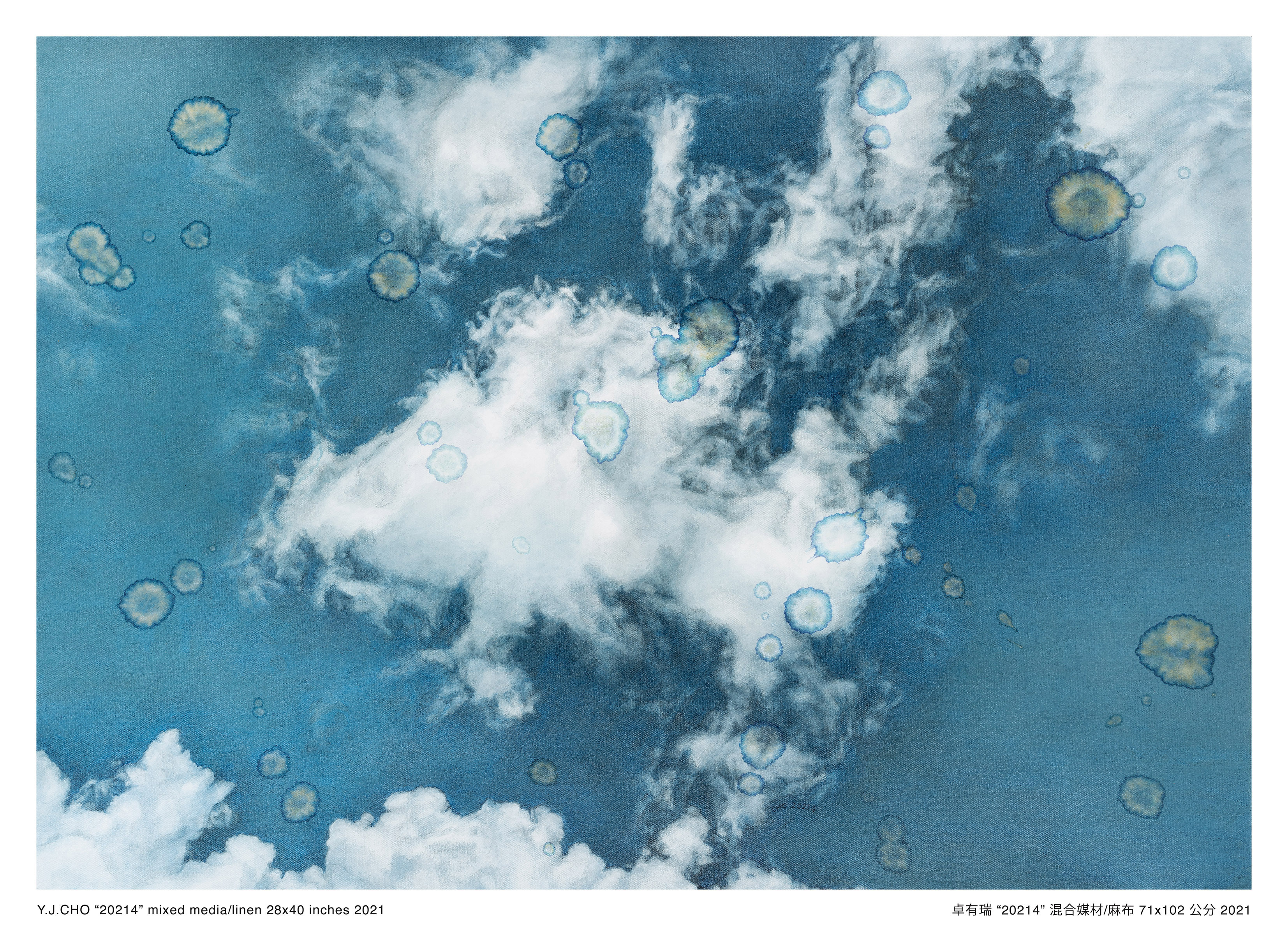 是次展出2020年創作的「霧影系列」及2021年創作的「蒼穹系列」,共十四幅全新作品。卓氏特意加入水漬的形象,以豐富視覺體驗並增加作品的可能性。卓氏著名的湮染水漬,原是無心插柳所得之意外效果,畫家把它移植到畫面上,令作品顯得更耐人尋味。水漬可以是飄浮的光印,為景色添上一抹詩情,或是透光玻璃上的水痕,使觀者有全新的視覺感受。