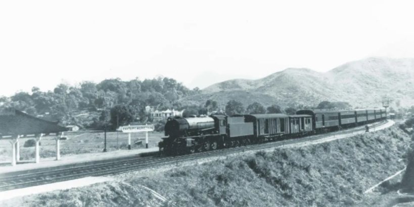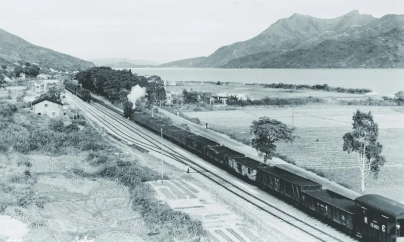 正靠近沙田站的列車及貨卡,約1949年