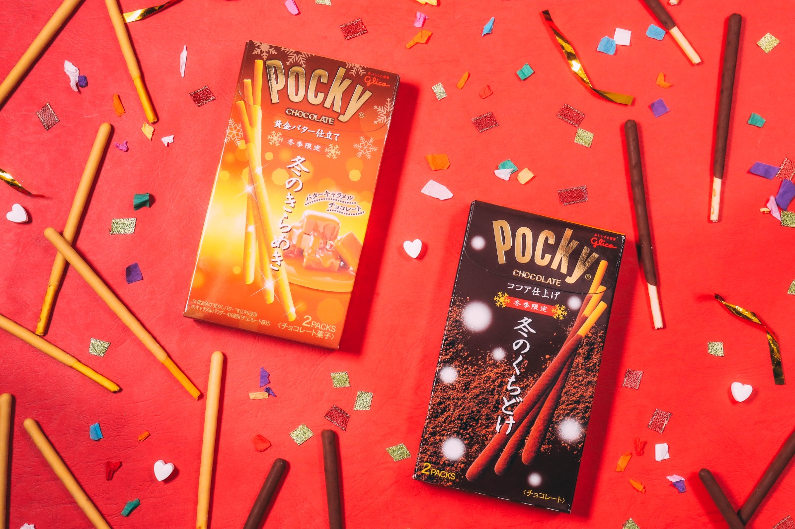 「Pocky 冬日限定版黃金牛油焦糖朱古力餅乾條」配以牛油及焦糖;「Pocky冬日限定版特濃朱古力餅乾條」以濃厚的朱古力包裹餅乾棒,加上可可粉。