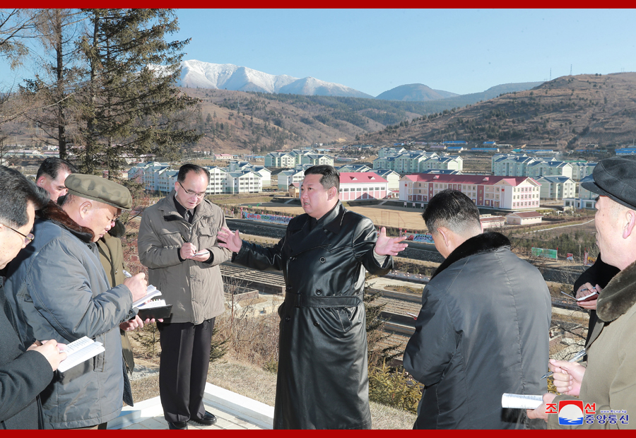 金正恩視察三池淵市城建工程第三期施工現場。