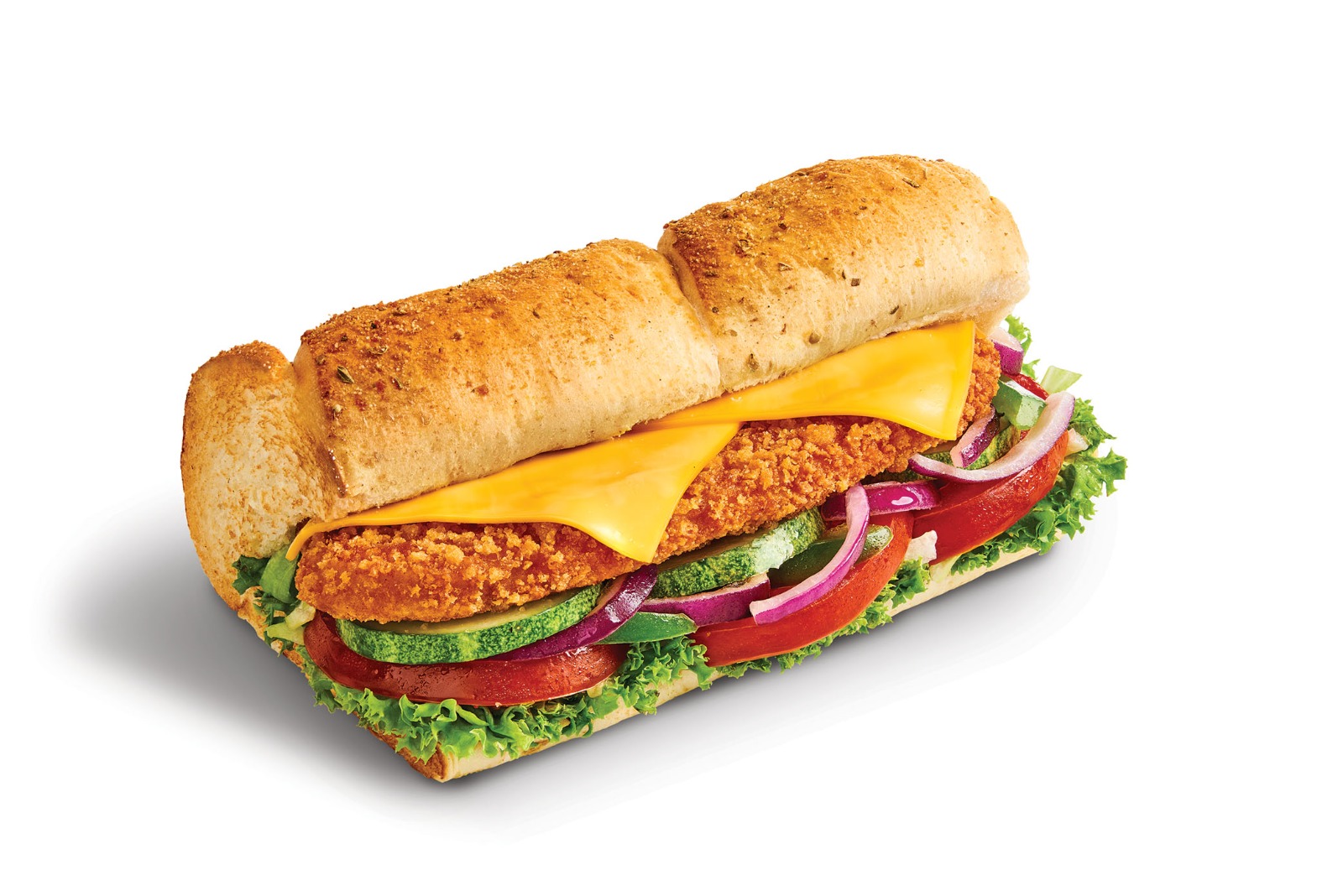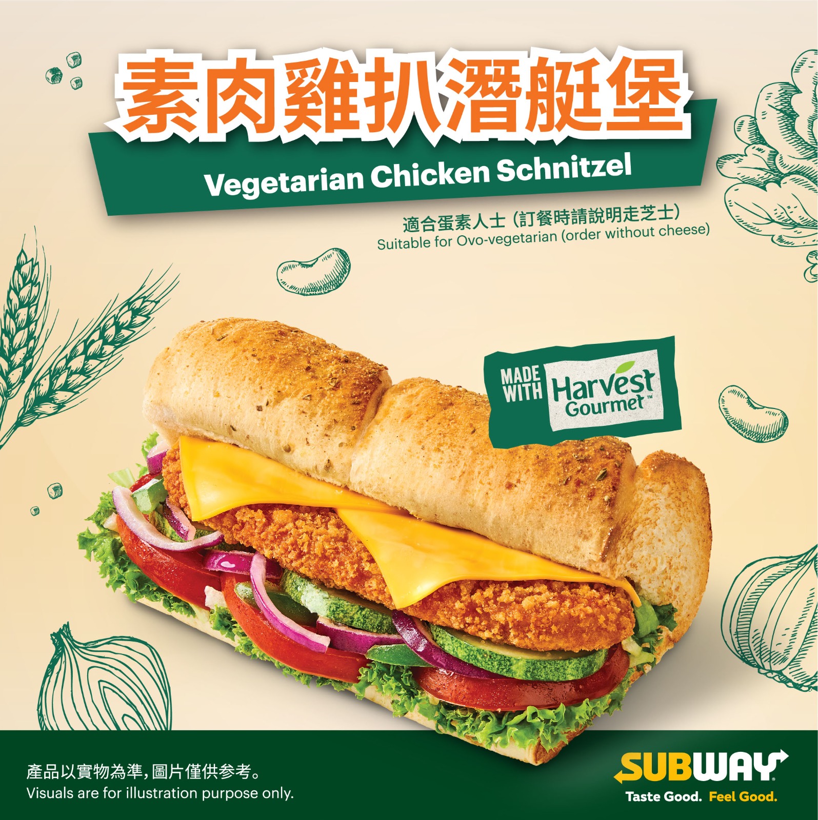 Subway推出的「6”素肉雞扒潛艇堡」以HARVEST GOURMET無肉酥炸排而製,採用非基因改造大豆蛋白製成,含豐富蛋白質及膳食纖維,不含膽固醇及反式脂肪,是有清真認證的蛋素食品。無肉酥炸排外層營造出酥脆感,潛艇堡加上生菜、青瓜、洋蔥、蕃茄及芝士,層次感多元化。