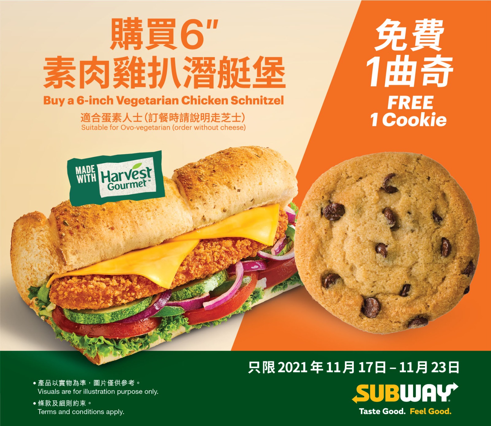 11月17日至23日期間,凡於全線Subway購買「6”素肉雞扒潛艇堡」,即可額外獲贈美味曲奇一塊。