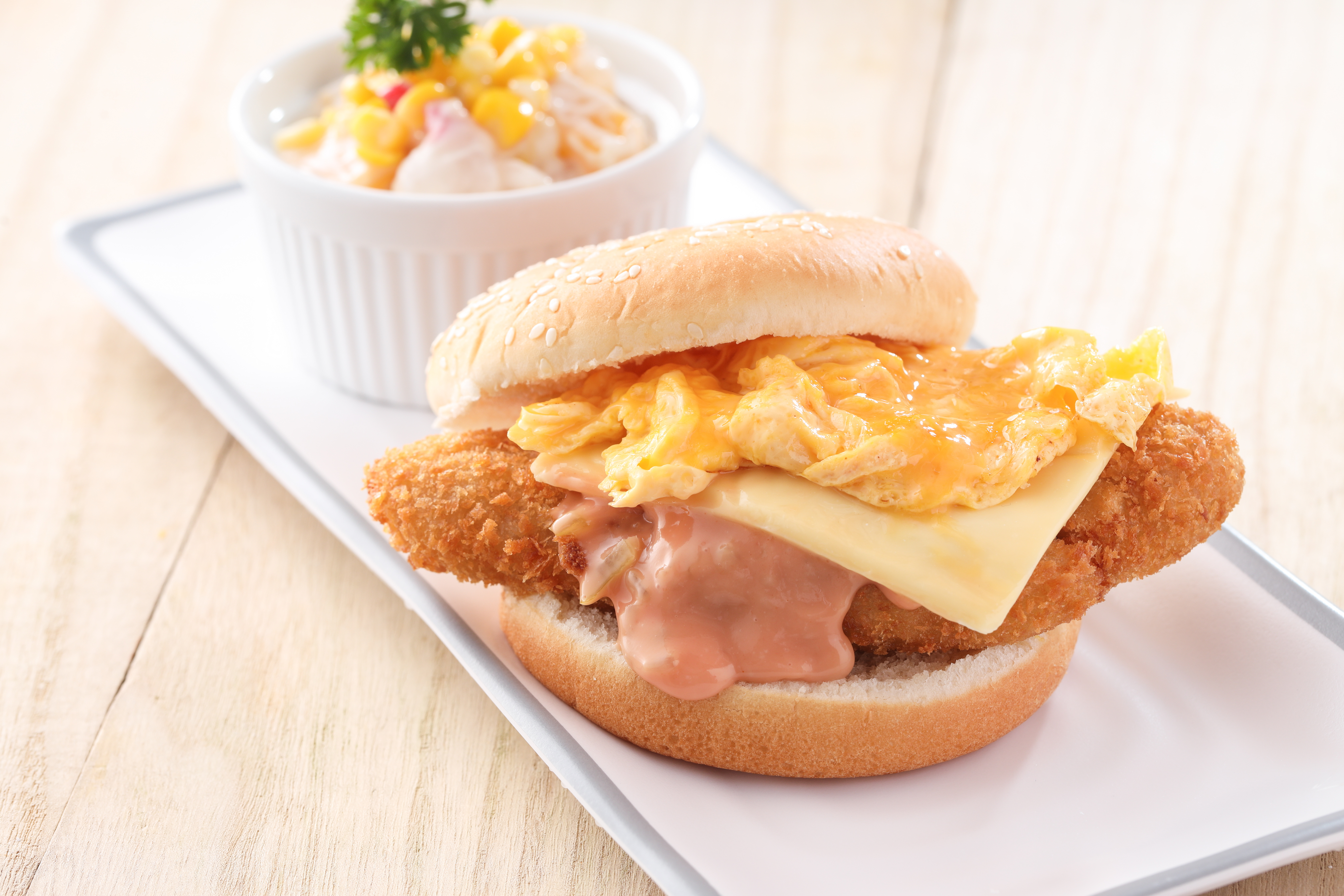 「港式滑蛋芝士吉列魚柳包」夾心包括牛乳炒滑蛋、即叫即炸的吉列魚柳、芝士片及千島醬