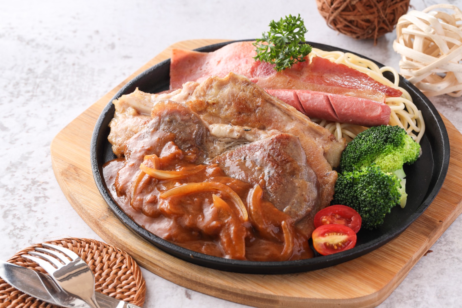 「懷舊鐵板美式什扒配洋蔥汁」包括牛扒、豬扒、腸仔、煙肉、火腿,一次過享受到不同肉類的滋味