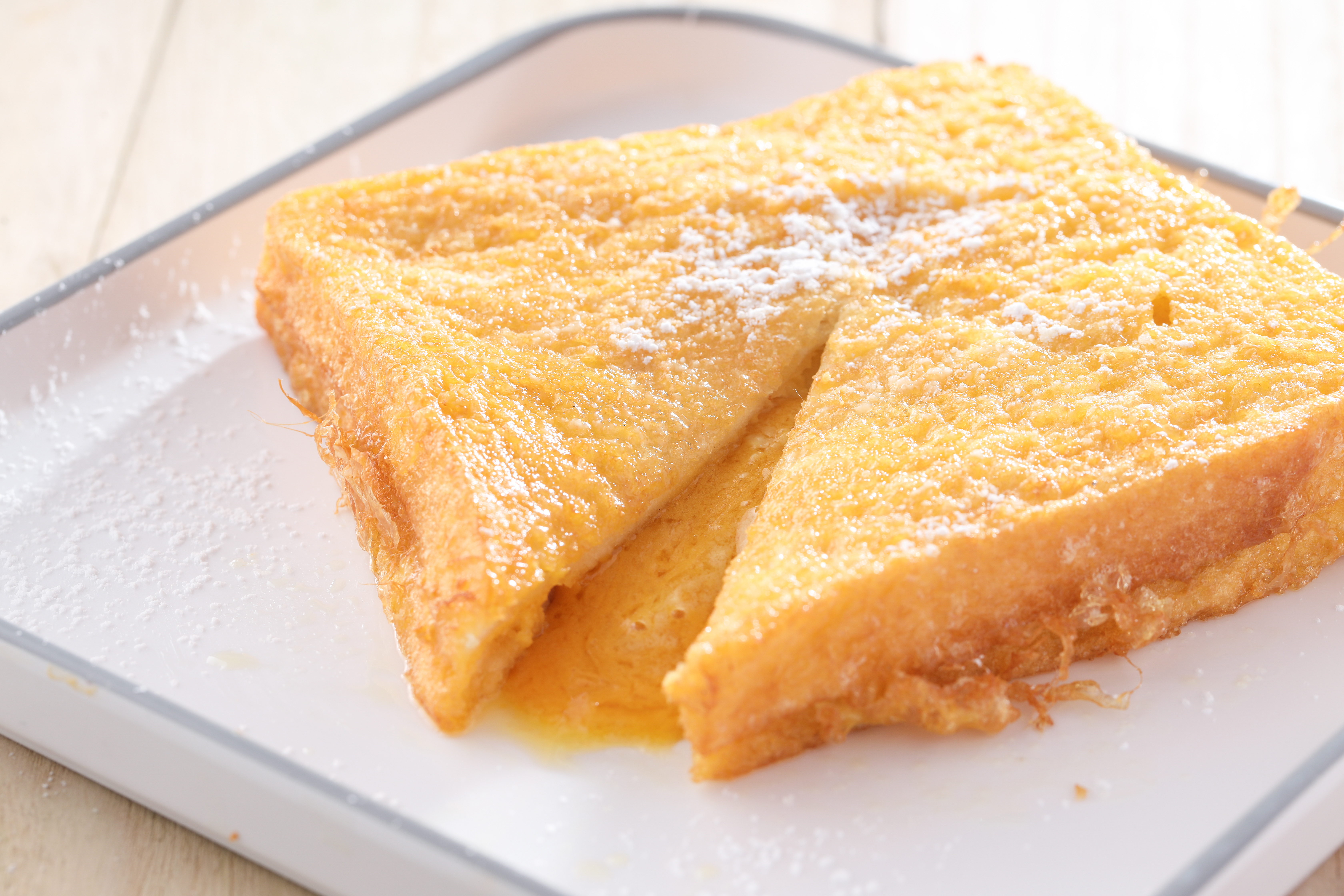 「雪花黃金奶黃流心西多士配杏仁霜」切開後會有流心奶黃餡湧出,當中夾雜鹹蛋黃碎