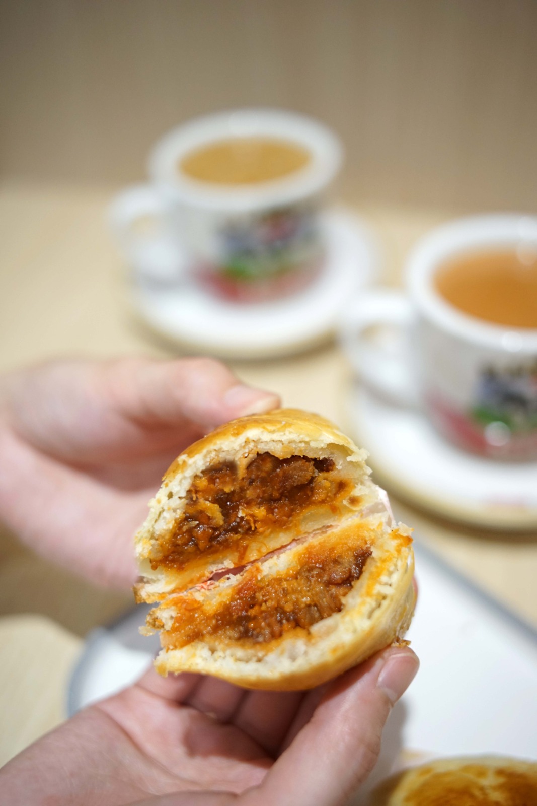 「招牌叉燒酥(2件)配即磨咖啡」($32)酥餅中的秘製叉燒餡,選用焾嫩梅頭肉秘方煮製,配合招牌鬆化的酥皮,是恆香唯一的鹹酥餅款式。