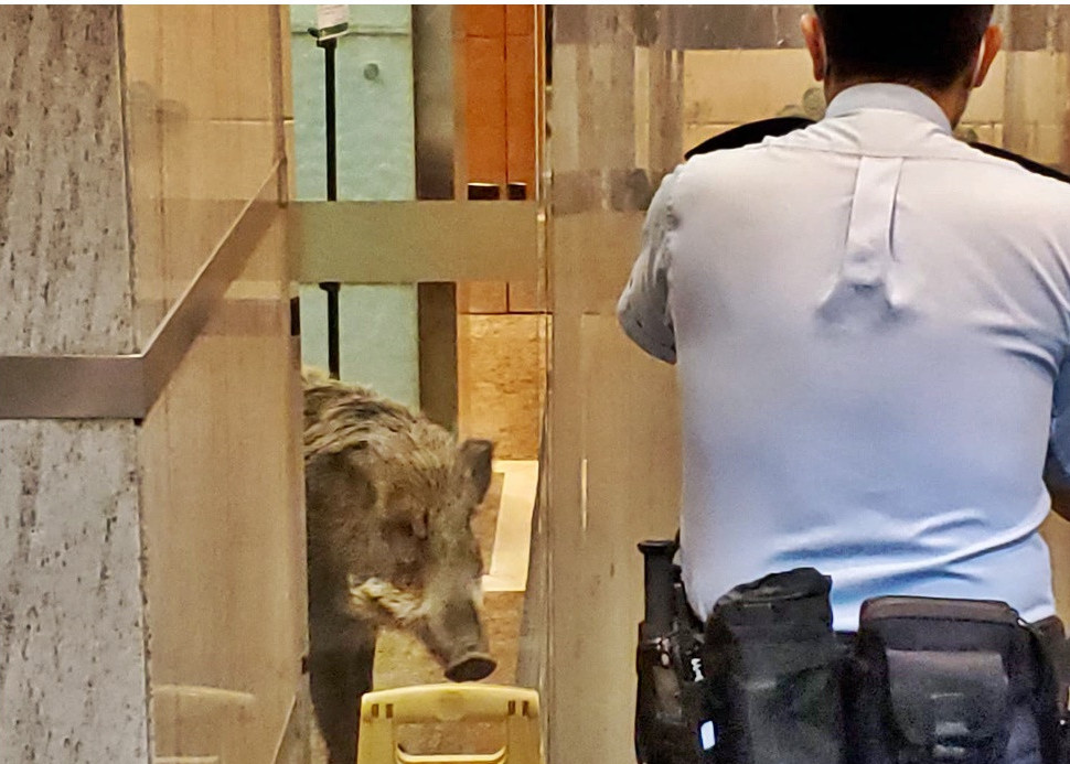 警方昨晚深夜11時許接報,指一隻野豬在天后廟道42號對開山坡被困鐵絲網。受驚的野豬其後自行掙脫,負傷在天后廟道一帶亂竄,期間闖入天后廟道18號傲龍軒地下大堂。