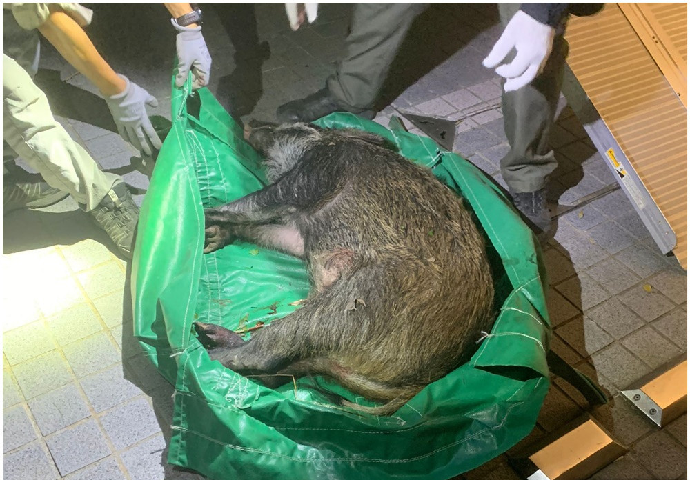 約半小時後,野豬跑回柏傲山停車場附近,漁護署人員在場戒備。到凌晨3時許,漁護署人員及獸醫三度拋出食物誘餌,最終發射三響麻醉槍將野豬制服,抬上車帶走。