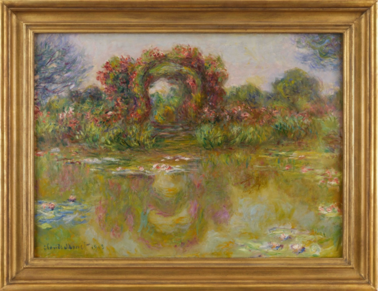 《睡蓮池與玫瑰》於1913年完成,是莫奈成熟風格的代表作。當時,莫奈置身於他最喜愛的吉維尼花園(又被稱為「莫奈花園」),描繪了一座玫瑰花拱廊立於平靜如鏡的池水上,池中蕩漾著一朵一朵的睡蓮,靜謐而嬌媚,將吉維尼花園在夏日勃發的生機表露無遺。本畫另一珍貴之處,是莫奈從這個視角繪畫的睡蓮作僅有三幅,《睡蓮池與玫瑰》便是當中尺幅最大的一幅(73×100 cm)。