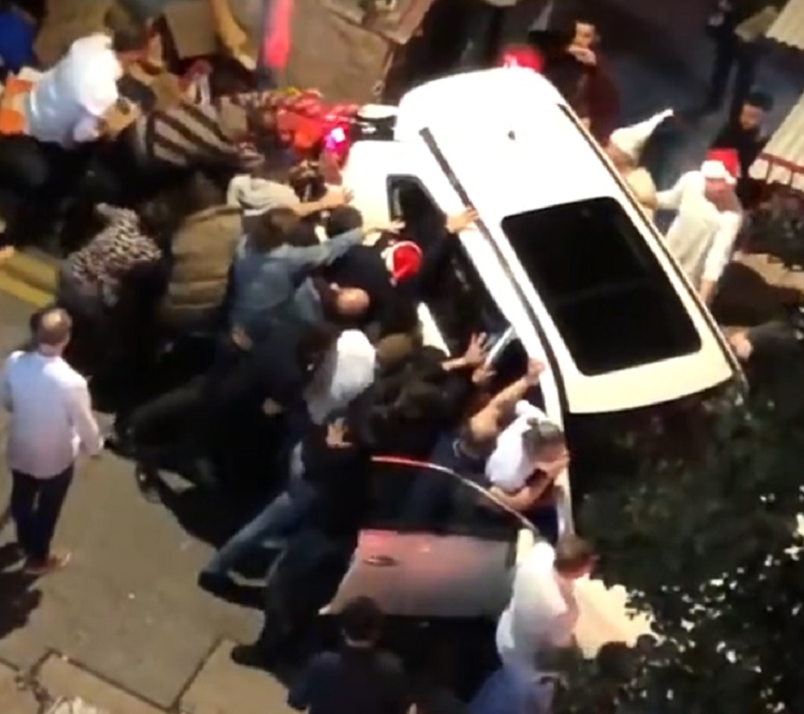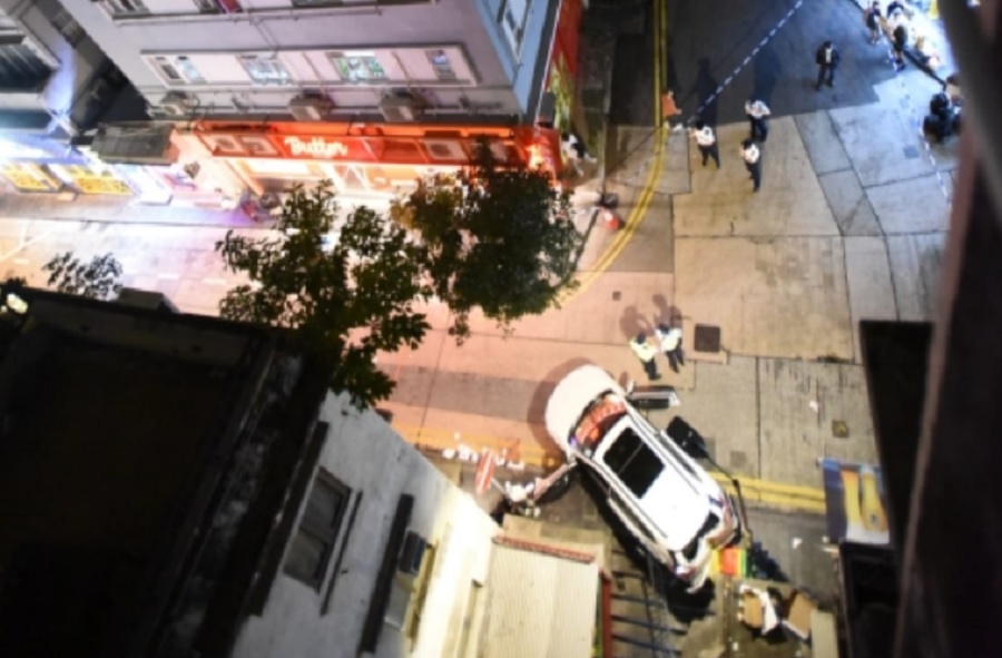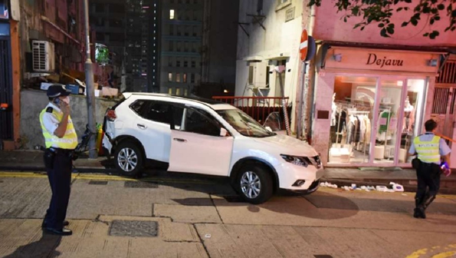 事發在昨晚八時許,一輛由四十四歲女外傭駕駛的四驅車,載同外籍僱主到蘭桂坊附近消遣,至卑利街七十號對開斜路停泊,車頭朝上;女司機與僱主下車準備關車門之際,疑有人忘拉或未拉緊手掣,全車沿斜路加速溜後,途中撞倒一家酒吧門外枱凳,當時數名男女在飲酒同被撞傷。