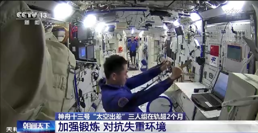 航天員翟志剛亦進行了鍛煉活動,他比較鍾愛太空跑台。航天員葉光富在人體系統研究機櫃前開展鍛煉,他手拿一個彈力帶,並隨時關注面前螢幕上的參數。