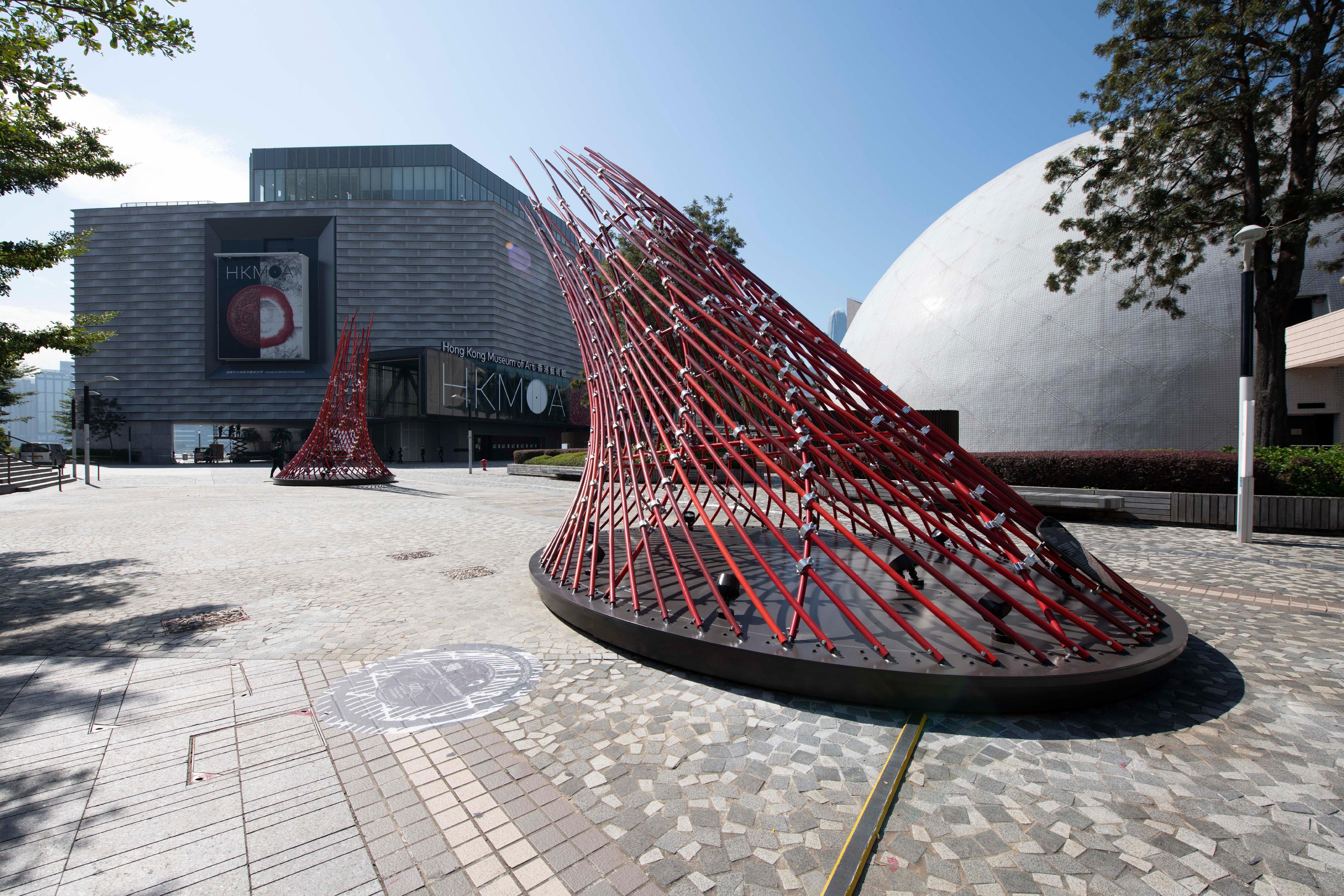 「虛實之間」現正舉行,展出本地藝術家高仕棠和高嘉文共同創作的戶外藝術裝置《回聲在目》