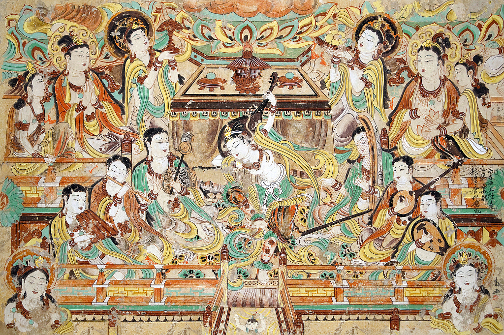 然而,天國歌舞卻是人間歌舞的寫照。琵琶這種樂器在漢代就從西方傳入,最早起源於美索不達米亞地區,而「琵琶」一詞大概來自波斯語中的Barbāt,漢代一度譯稱「批把」或「枇杷」,晉以後改稱「琵琶」。傳入中國的四弦琵琶直接來自龜兹,所以又稱龜兹琵琶。龜兹改進西亞兩弦琵琶,成五弦曲頸,不過傳入中原後又被改為四弦,據宋代《樂書》稱,是以法四時天地。