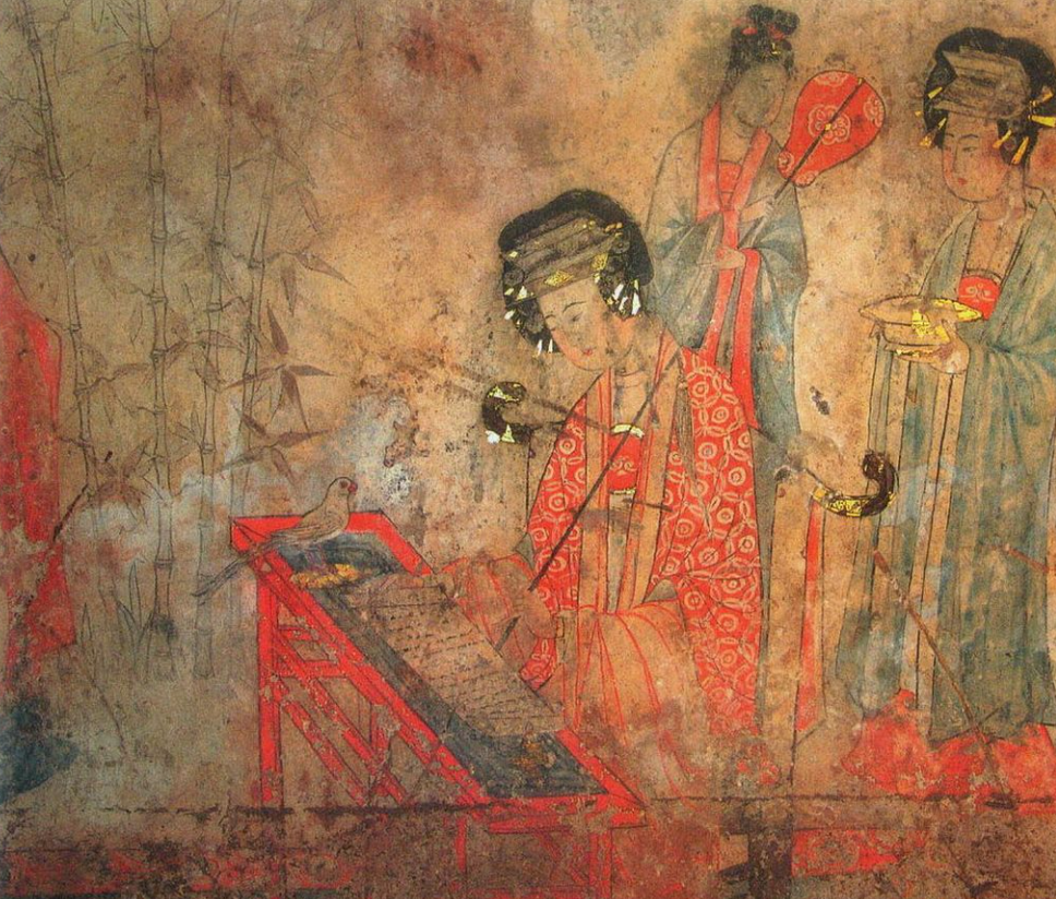寶山遼墓壁畫「楊貴妃教鸚鵡頌經圖」