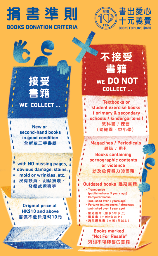 捐書準則為全新或二手書籍,沒有缺頁、明顯損壞、發霉或摺痕等,而且書本原價不低於10港元。另外必須留意,主辦單位不接受幼稚園和中小學的教科書或練習簿,亦不接受雜誌、期刊、涉及色情暴力、過期書籍(包括出版五年以上的旅遊指南、出版兩年以上的電腦書及出版一年以上的流年運程書),以及所有列明「不可轉售」的書本。大家出發前記得注意各中心的開放時間,以免白行一趟。