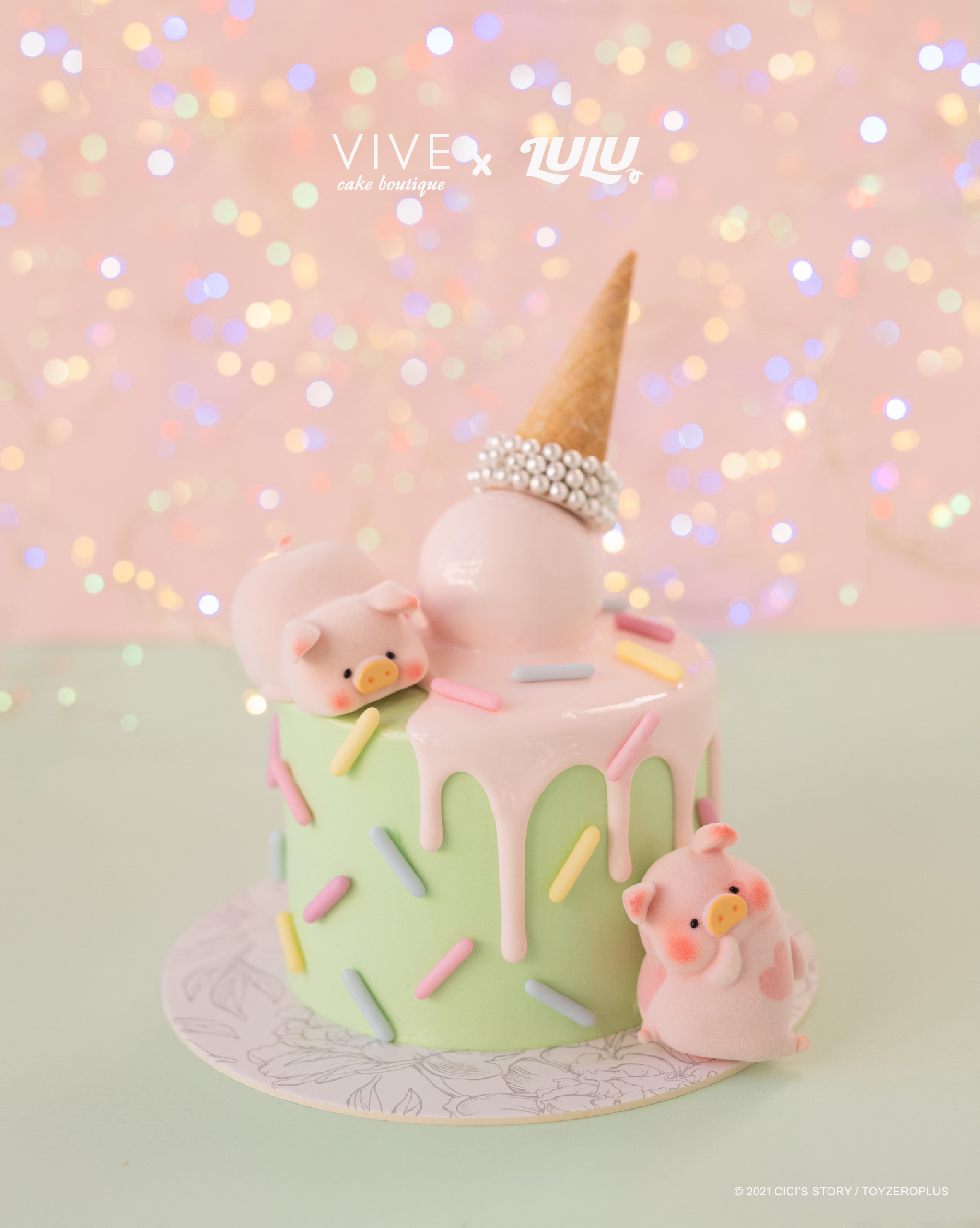 「LuLu Cone」(港幣$980/1磅)蛋糕上放置了兩隻LuLu豬,款式會以盲盒形式隨機抽出。蛋糕口味可選VIVE熱賣的紅絲絨蛋糕配忌廉芝士、伯爵茶蛋糕配伯爵茶忌廉、朱古力蛋糕配朱古力牛油忌廉、香蕉蛋糕配朱古力牛油忌廉或雲呢拿海綿蛋糕配芒果柚子慕絲。