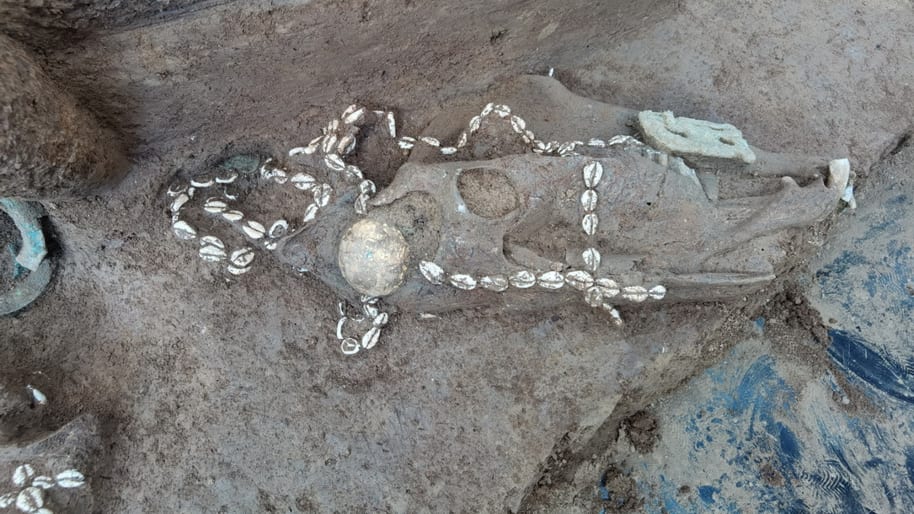 已發掘的18座商代墓葬中,以「中」字型大墓被盜的情況最為嚴重,團隊只在墓內發現少量陶器,但在其他墓坑中,就發現了由骨頭和蛤殼製成的工具,以及20多套青銅禮器,如鼎、觚、爵等,更出土了6輛馬車,以及幾匹馬的遺駭和一些認為是殉葬的人——殉葬在商朝時期十分常見,尤其是對於那些地位較高的人,例如是皇室成員,而許多出土的遺骸身上都戴著奢華的裝飾品,有些則戴著貝殼串飾的帽子,就連殉馬的頭上亦有金飾。可見這個古墓的主人擁有一定的地位和財富。