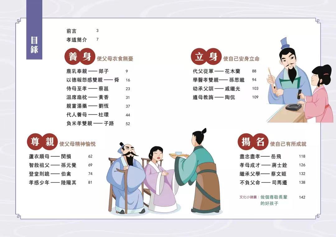 書中有許多孩子耳熟能詳的中國古代名人,例如代父從軍的花木蘭、藥王孫思邈、撰寫《史記》的司馬遷等,並涵蓋部分二十四孝故事,例如舜、黃香、閔損等,內容豐富。