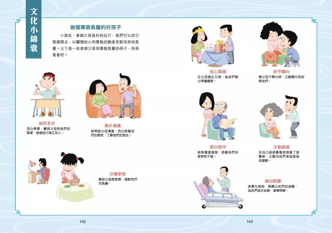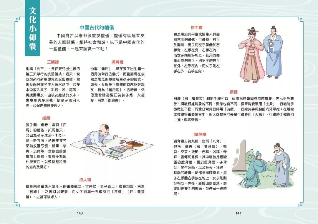 本篇「文化小錦囊」收錄了一些在不同場合、對於不同的人所做的相應的禮儀,以增長孩子的中華文化知識。