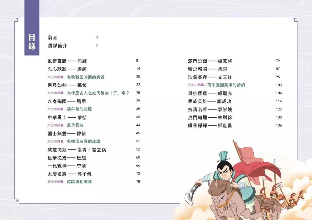 中國古代的英雄對中國歷史和文化都有深遠的影響。在「文化小錦囊」裡,孩子可以學習到和這些英雄有關的詩詞、成語、節日,甚至飲食文化,有助開闊眼界。