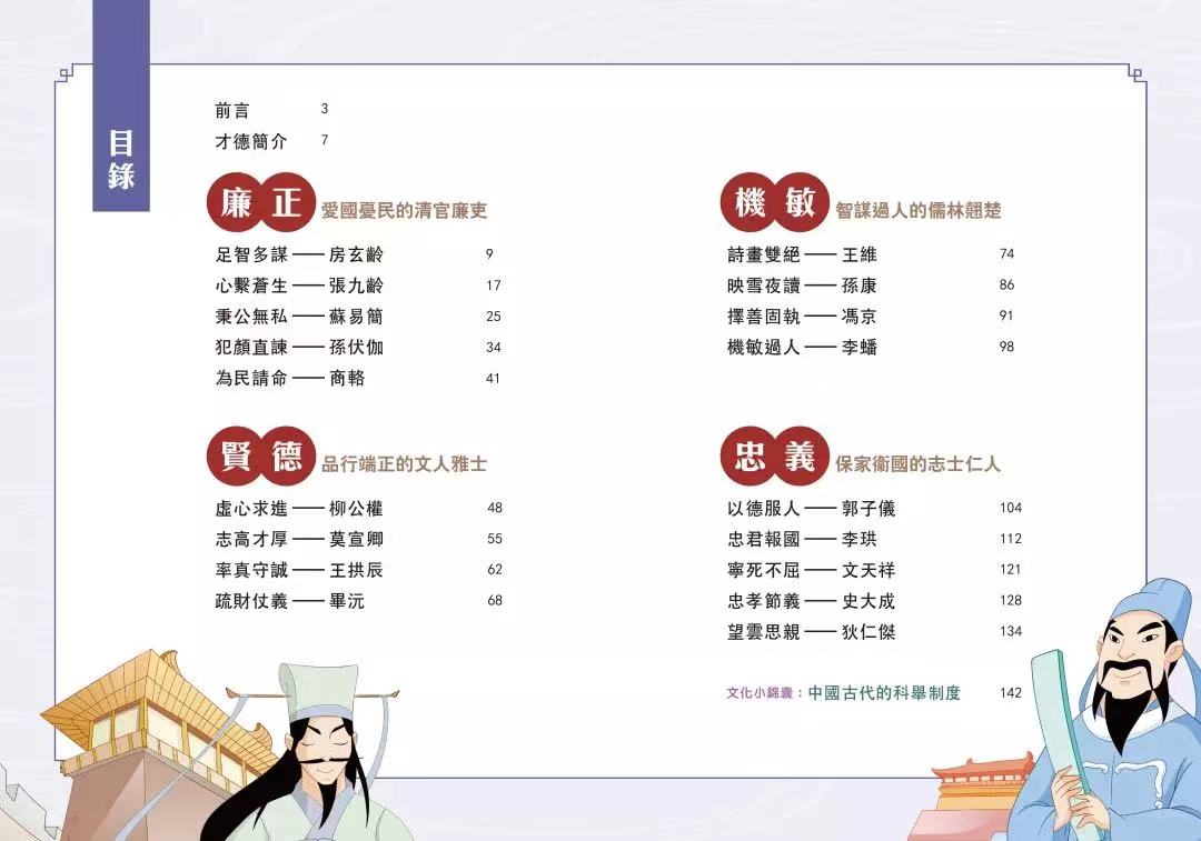 書中有許多狀元的故事。在古代,狀元及第是才德兼備的精英所能獲得的最高榮譽,他們如何勤學用功,並發揮才能為百姓謀福祉呢?這些才德之士都可以成為孩子學習的好榜樣。