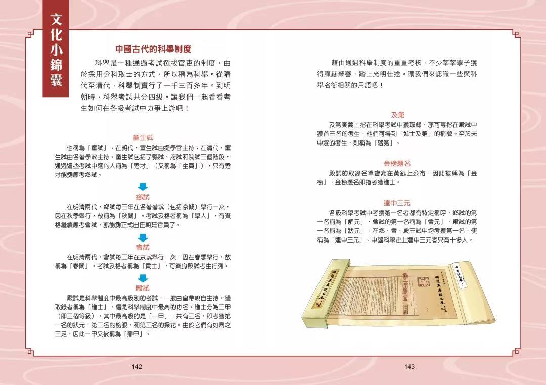 科舉是古代最主要的選拔官吏制度。在「文化小錦囊」中會深入淺出地解說這個制度,讓孩子認識何謂「狀元」、「榜眼」、「探花」、「及第」、「金榜題名」、「連中三元」等詞語的意思。