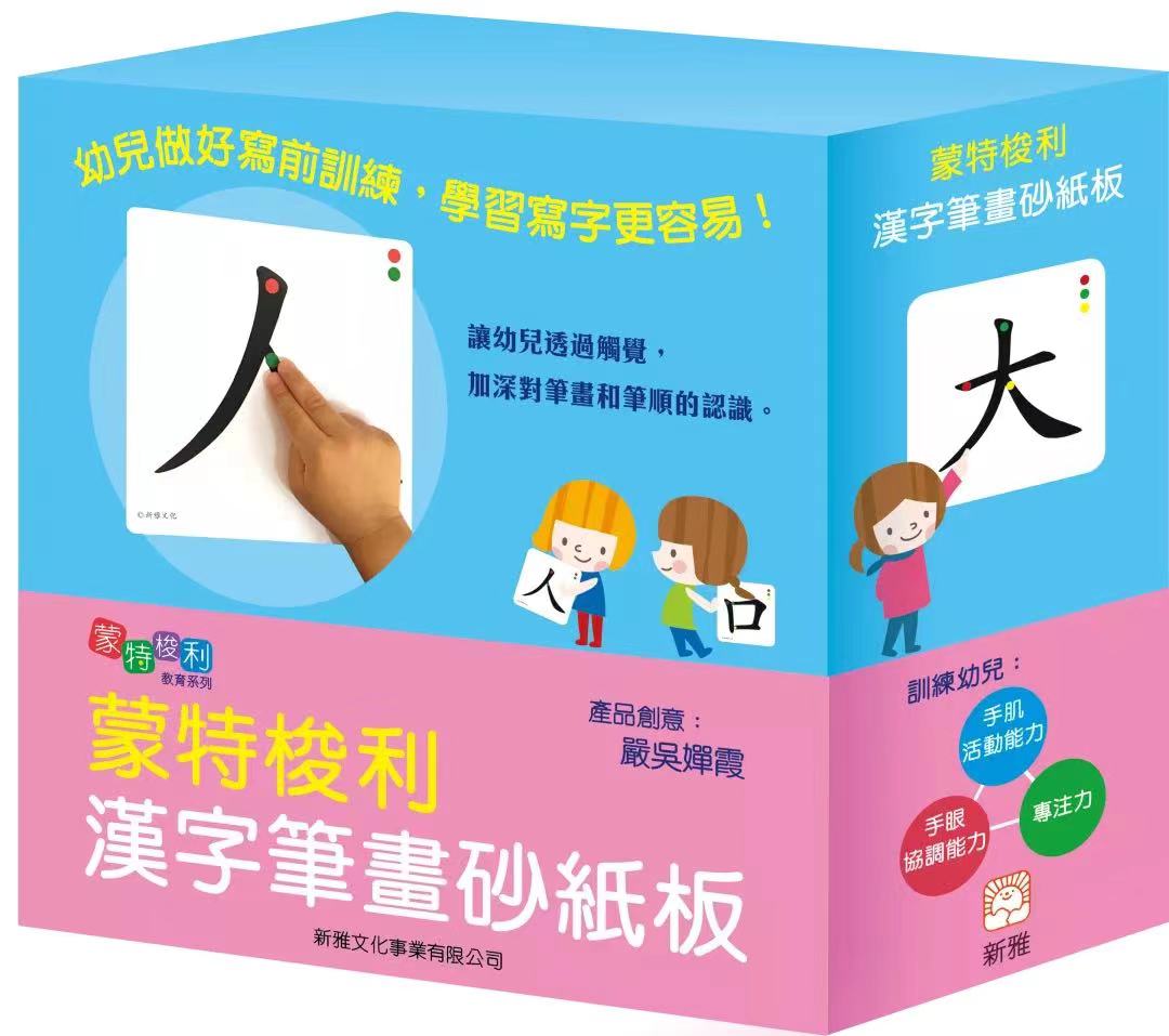 第一,蒙特梭利的教學理念,源自西方,本用於英文字母的學習,然而取其優勢用於幼兒學習漢字上,效用同樣顯著。幼兒的塗鴉期始於兩歲,家長如能把握這黃金期,配合專業設計的教學工具,就能把小小孩的認字力和書寫力引發出來!