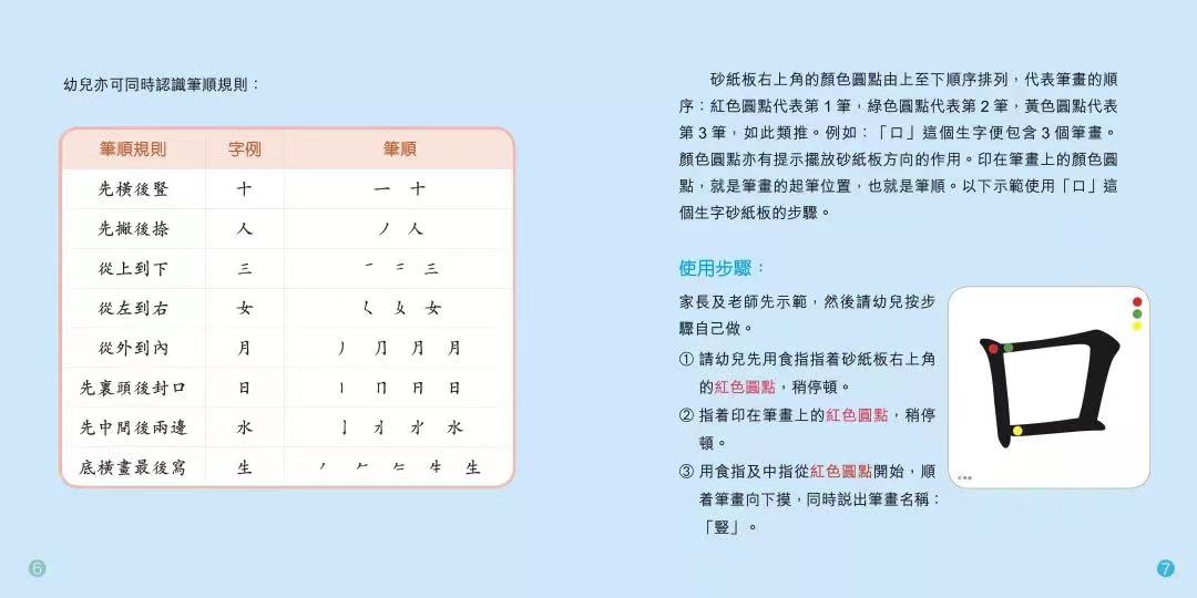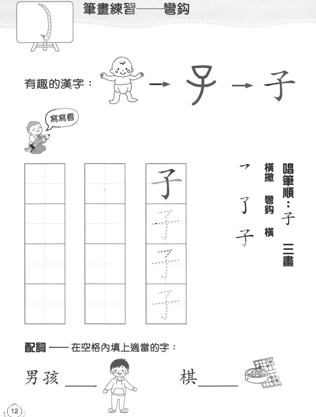 選材細心嚴謹,八個基本筆畫是學習書寫漢字的起始,十六個生字除讓孩子認識筆順規則,同時也是漢字的部首偏旁。