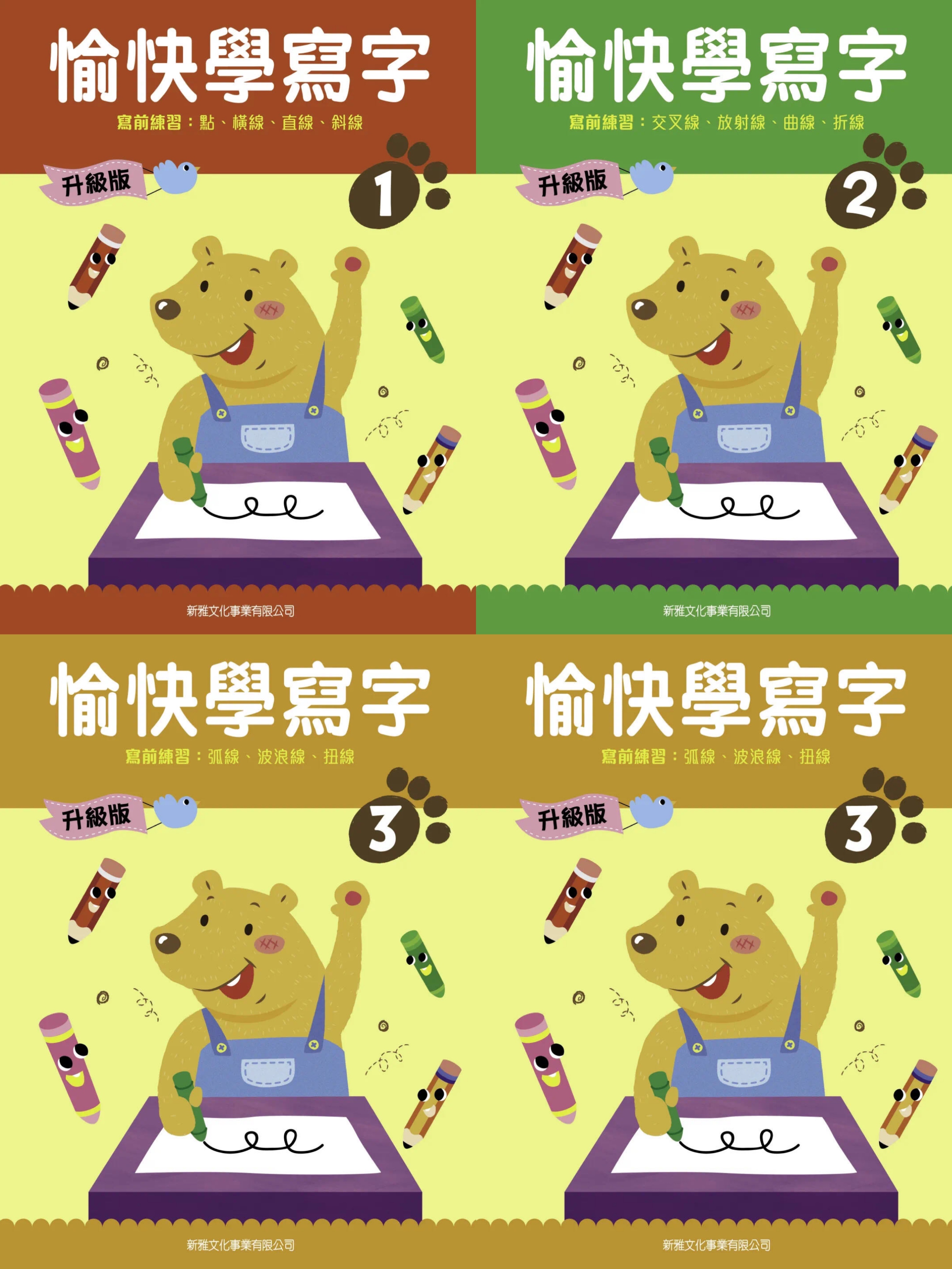 《愉快學寫字(升級版)》就是要讓孩子寫得開心,學得愉快,從此愛上寫漢字。值得注意的,這套教材一開始是以四冊繪畫線條的基本功開始,並不急於寫一個完整的生字,這正好作為《蒙特梭利漢字筆畫砂紙板》之後的延續:讓孩子用觸感學習筆畫和筆順,準備好靈活的小指頭之後,在正式執筆之時,就由簡單的線條開始,打好寫字的基礎,最後慢慢寫出完整的字。