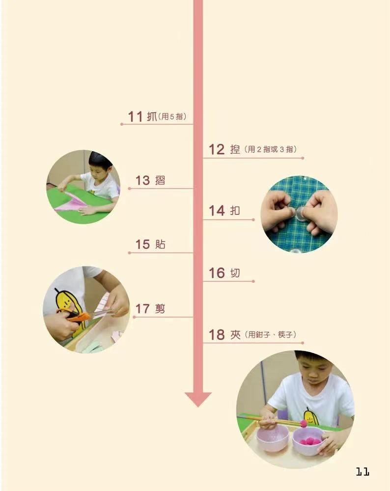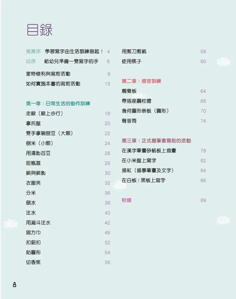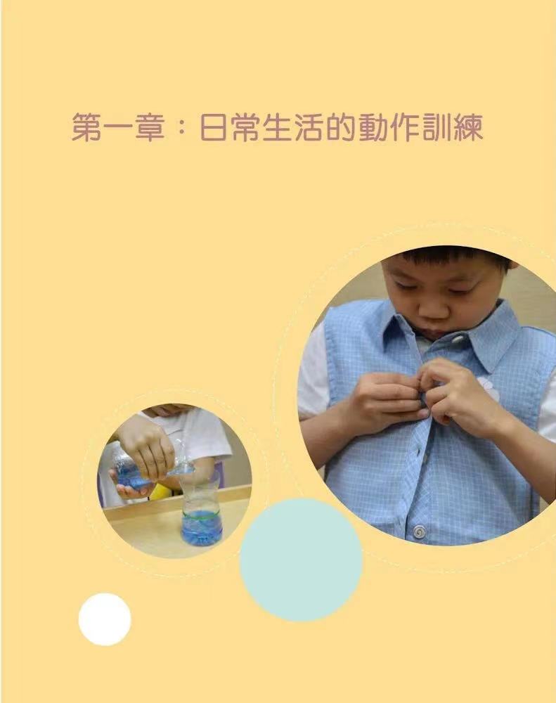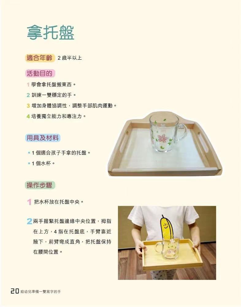 書中的動作訓練,不僅鍛煉孩子手眼協調、大小肌肉等能力,還能培養孩子在日常生活中的自理能力以及基本禮儀,做個能照顧自己而且懂規矩的孩子,例如:扣鈕扣、拿托盤、倒水等。