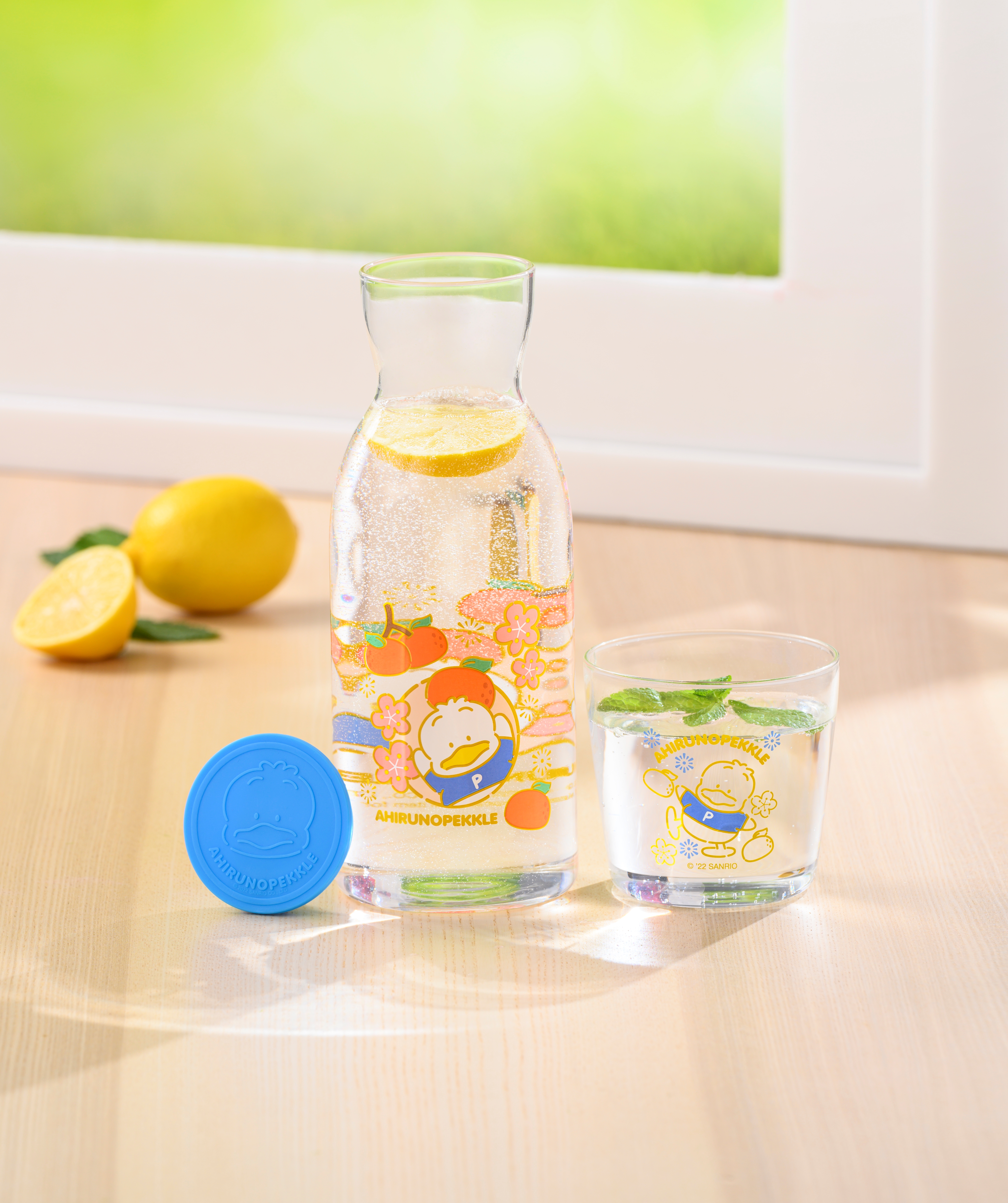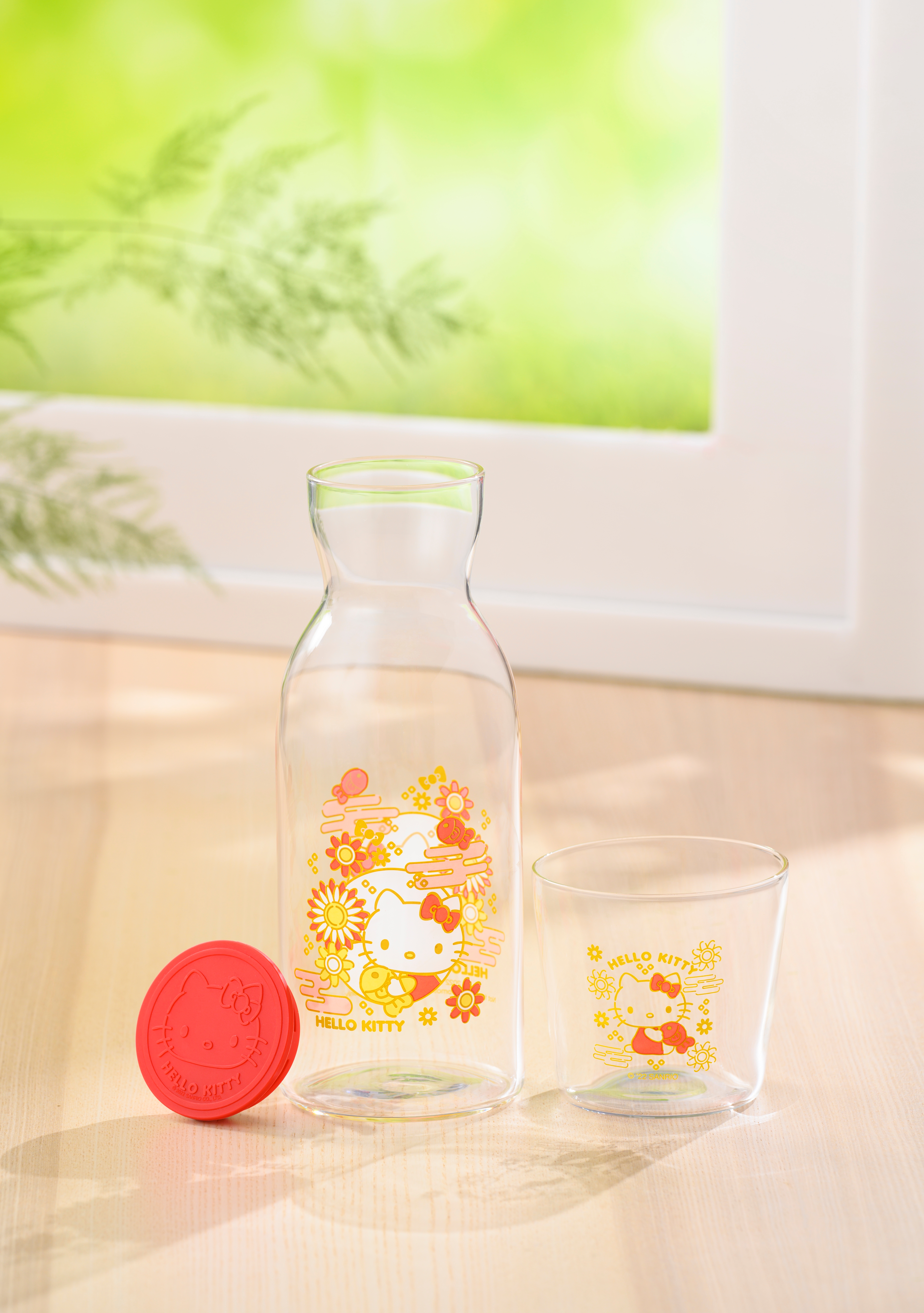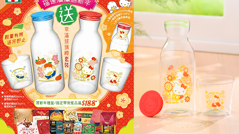 是次7-eleven便利店聯乘兩位Sanrio的人氣角色─Hello Kitty及AP鴨,推出兩款「常滿玻璃樽套裝」,當中設「玻璃樽」及「玻璃杯」各一件,寓意水為財,將財氣帶入家中。瓶身及杯身均印有桃花、雲海、 年桔等具新年氣息的圖案。另外印有Hello Kitty或AP鴨,瓶蓋上更有角色的凹凸造型圖案,可愛又實用。