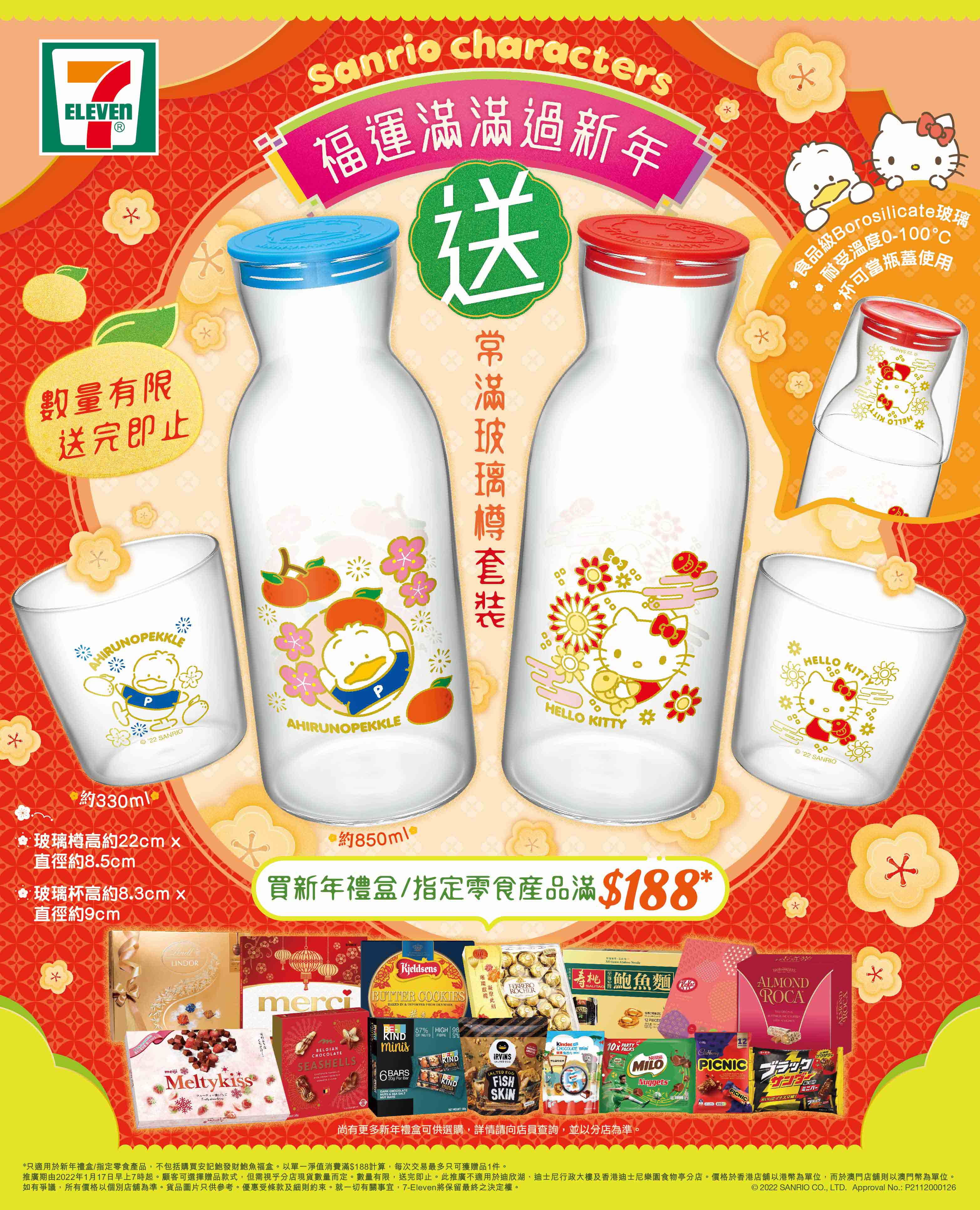 即日起大家凡於7-Eleven分店購買新年禮盒或指定零食產品滿$188,即送「Hello Kitty / Ahiru no Pekkle 常滿玻璃樽套裝」一套,款式視乎分店現貨數量而定。數量有限,送完即止。推介禮盒有「瑞士蓮精選軟心朱古力禮盒14粒裝」($59)、「丹麥藍罐曲奇 908 克」($126.5/盒)、「蜜思精選特級朱古力禮盒 250 克」($38)、「KITKAT 禮盒日本版」($59.9)等。