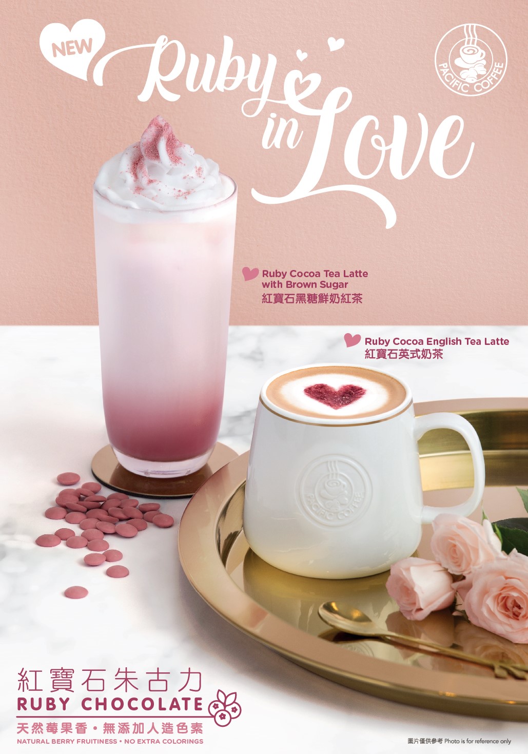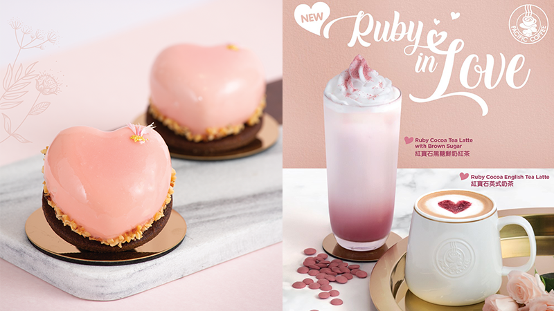 Pacific Coffee以擁有天然莓果香、色澤呈鮮粉紅的紅寶石朱古力為主題,加上經挑選的香醇茶葉,調配出兩款情人節必備的特飲