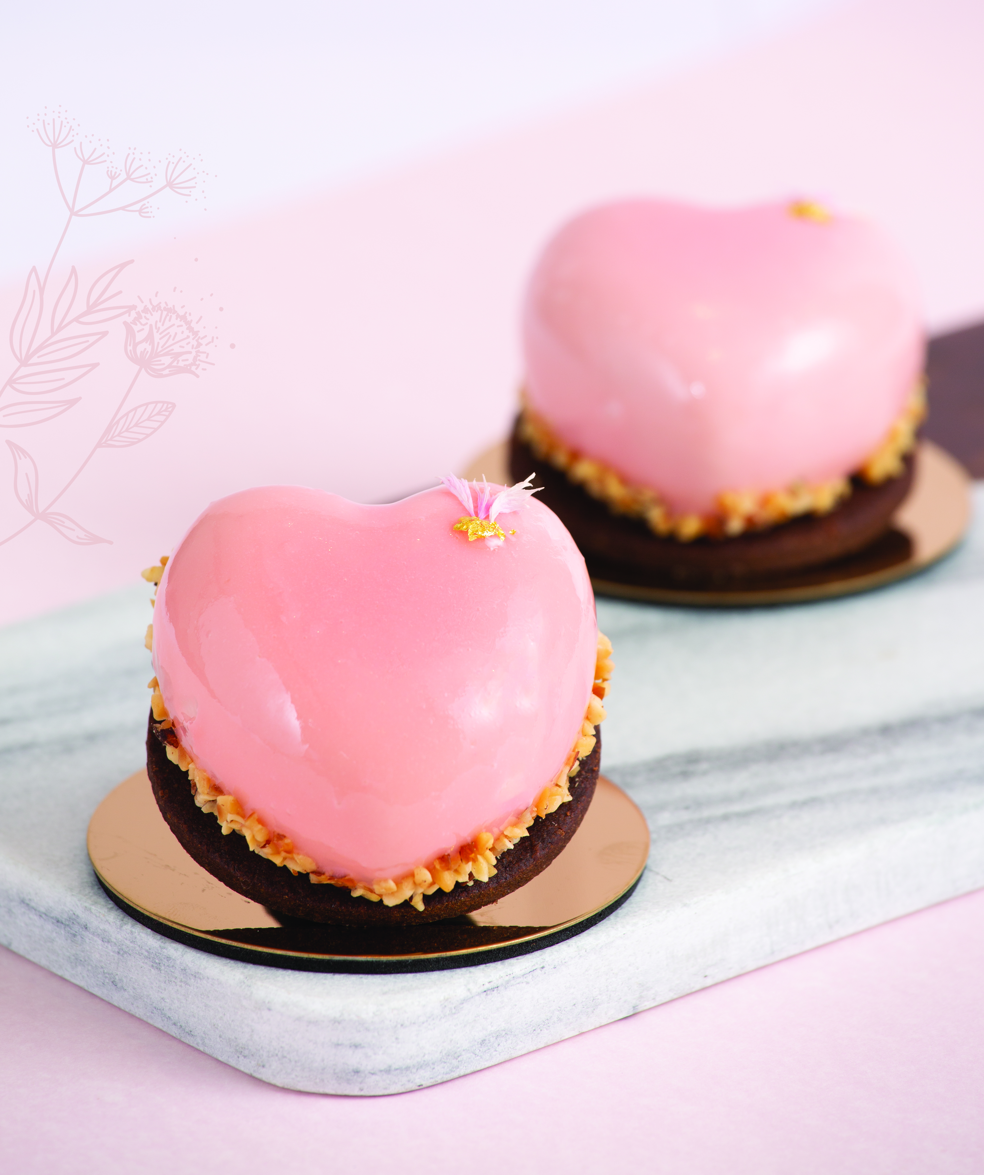 「甜絲絲(紅桑子慕絲)」($45/件)以充滿少女心的浪漫粉紅心形造型為設計,紅桑子慕絲包裹莓果夾心而成。另外配合經典海綿蛋糕及脆餅底,加入杏仁及榛子碎作點綴,豐富口感。