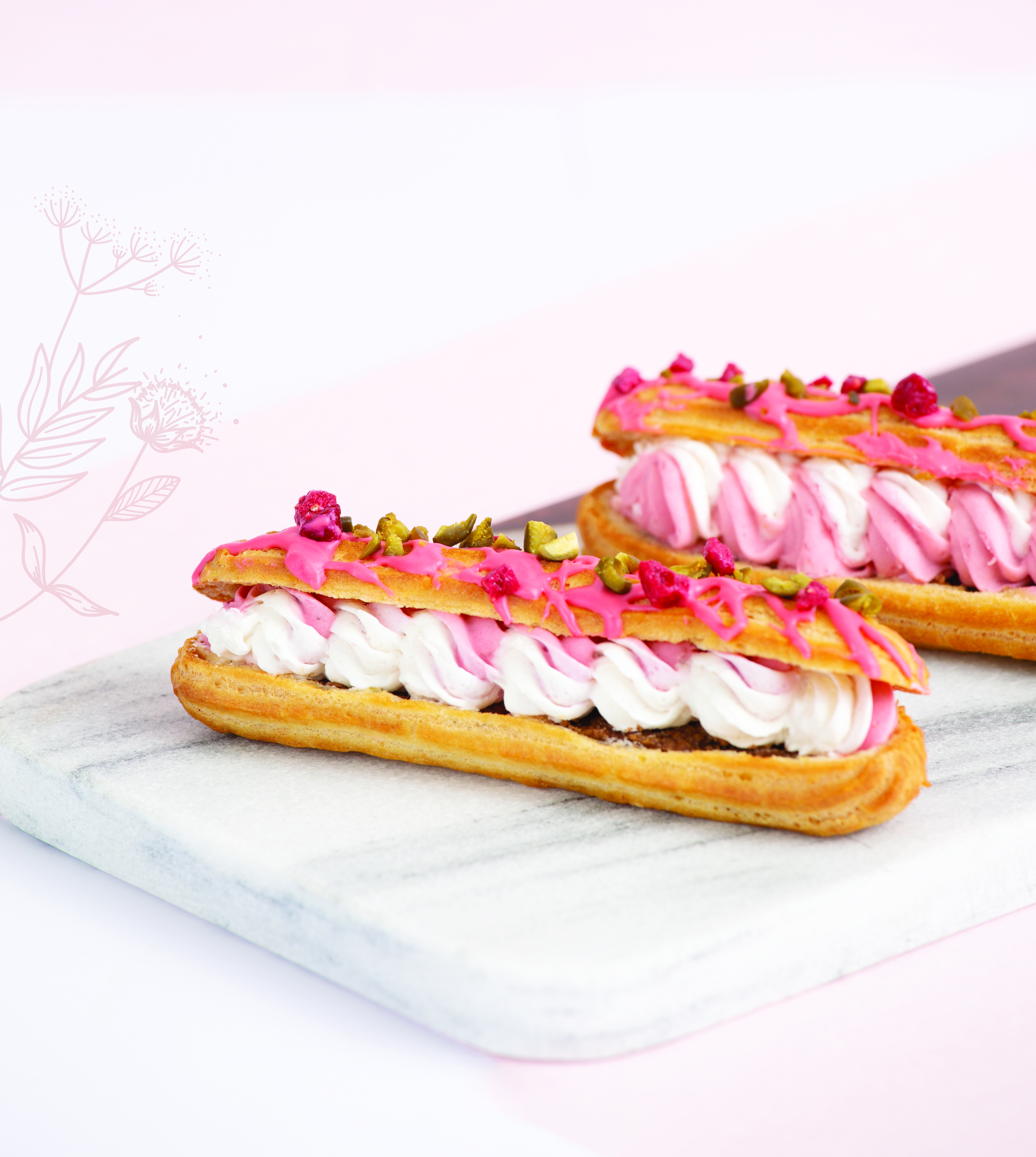 「雜莓白朱古力法式泡芙」於經典法式泡芙夾層唧入粉紅雙色白朱古力忌廉,外層灑上開心果碎及雜莓粒