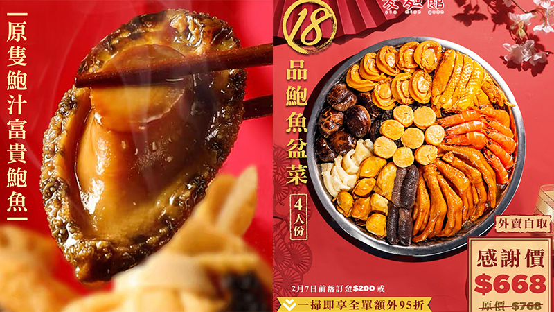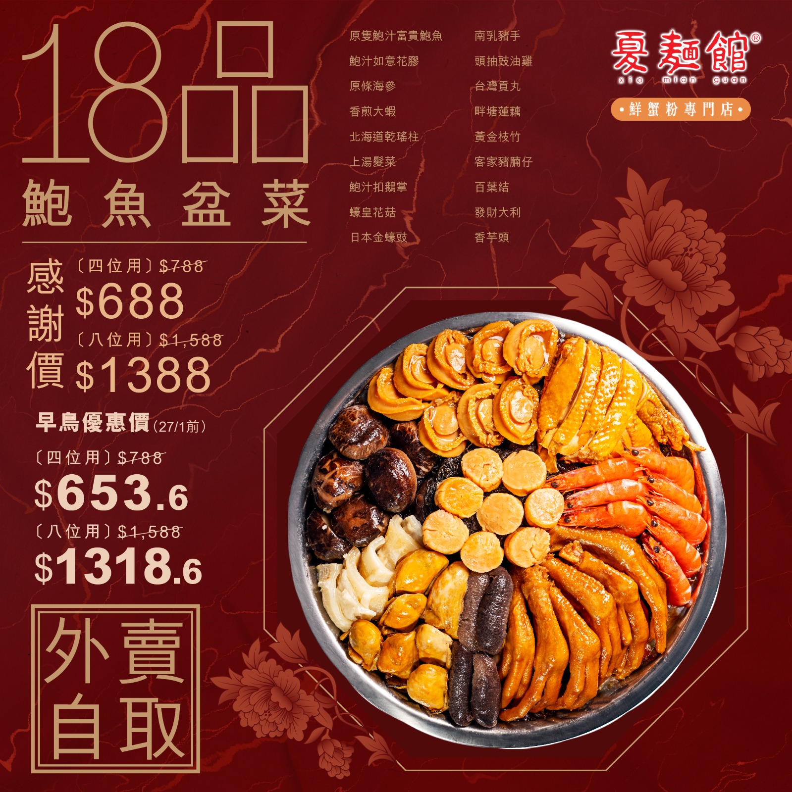 「夏麵館」推出「18品鮑魚盆菜」,現時透過網上平台訂購,可以優惠價$639四位用(原價$788)及$1,290八位用(原價$1,588)享用到