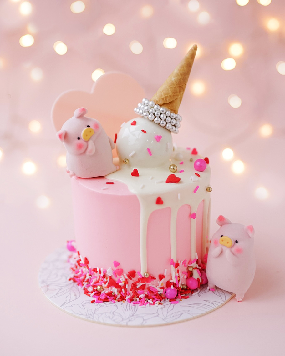 招牌粉紅色「Uni-cone」蛋糕則變奏成「Love You Like a LuLu」,兩隻LuLu豬依偎於雪糕筒旁及蛋糕側邊
