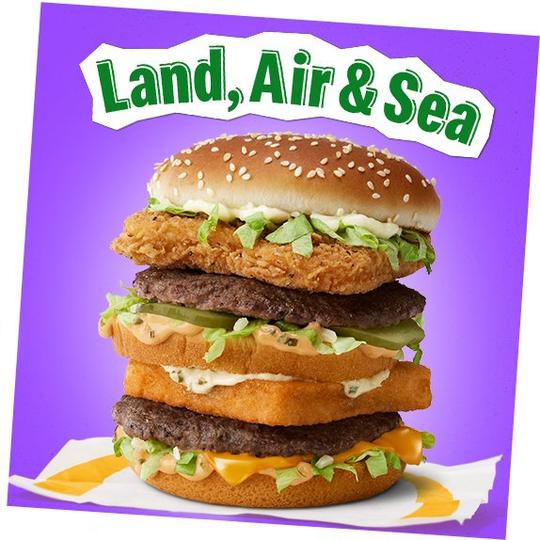 「Land, Air and Sea」則來自Julian Broadway的構思,以麥香雞、魚柳包加上巨無霸三大漢堡,創作出超邪惡的海陸空漢堡組合,單看賣相都感覺到卡路里的數字驚人。