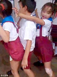 這位小女孩更大膽地讓男孩躺在身下,熟練程度讓人懷疑這是否有人教導。更讓人大呼少兒不宜的是,之後她們竟然來了個「三人舞」,男孩被兩個女孩夾在中間。
