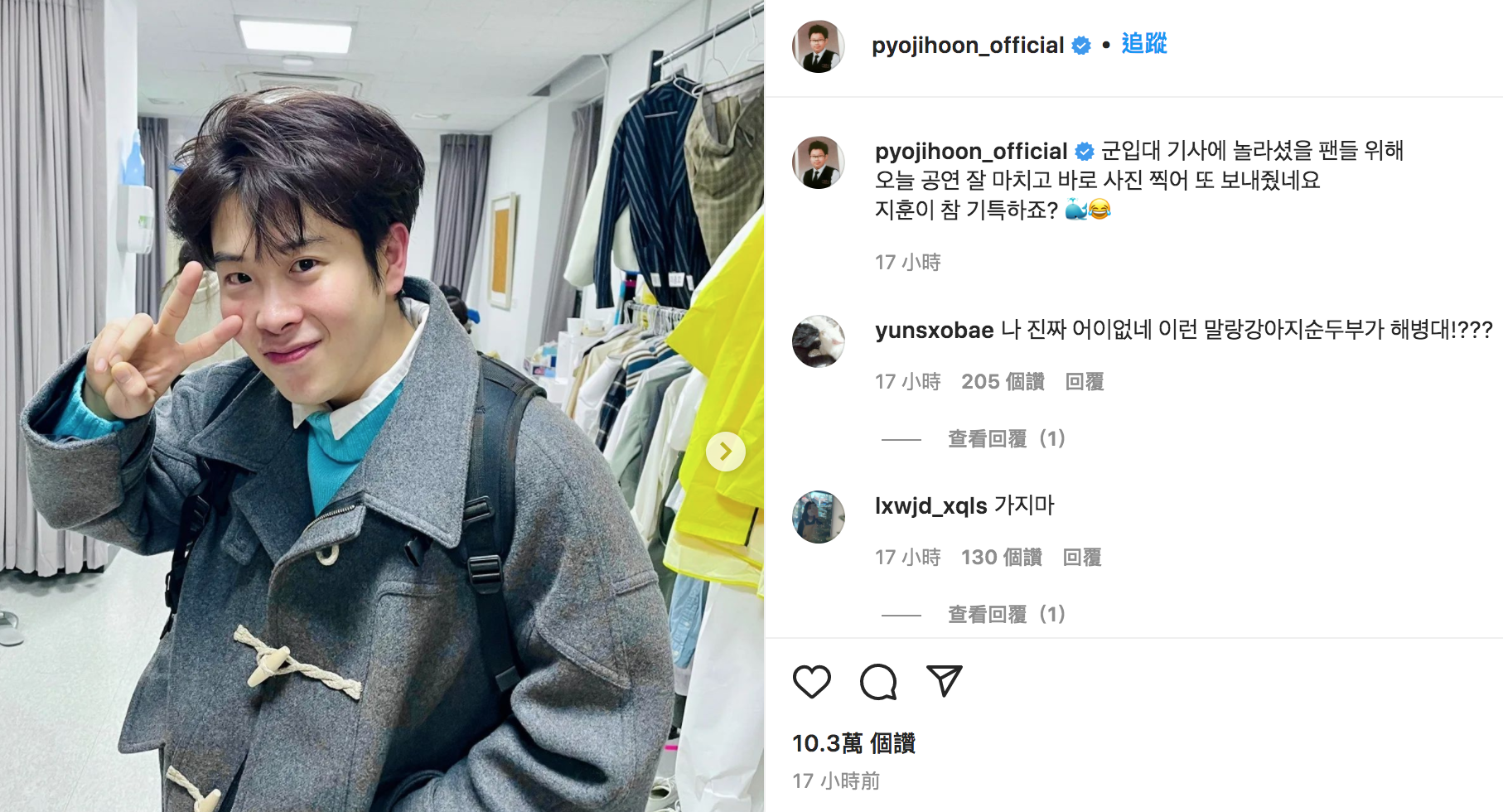 入伍的消息傳開後,P.O於IG上載個人照安慰一眾粉絲,粉絲流露不捨之情,留言「別去!」「今天我的世界崩塌了……」