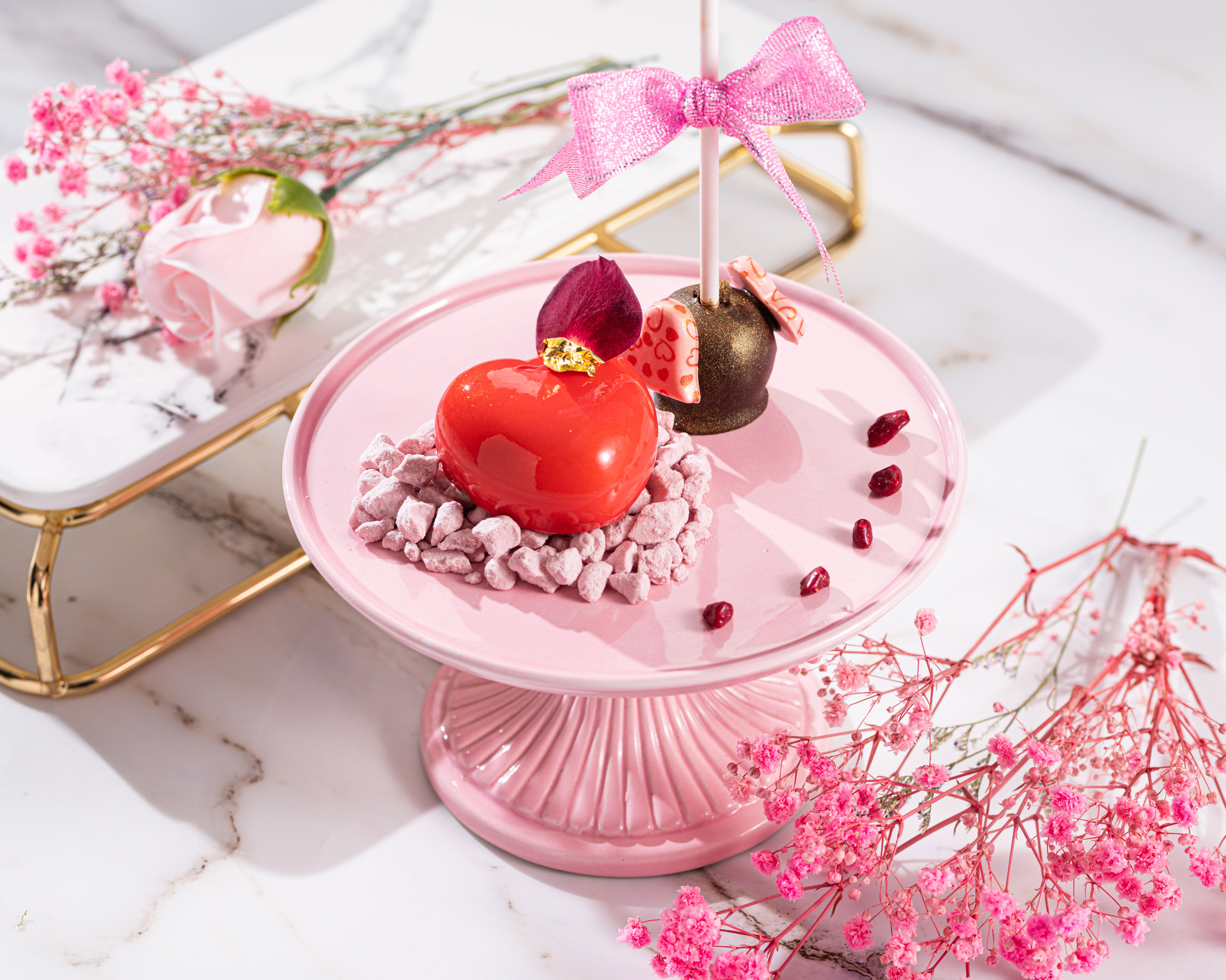 最後以紅桑子朱古力心型餅配法式燉蛋及百利酒棒棒糖作結