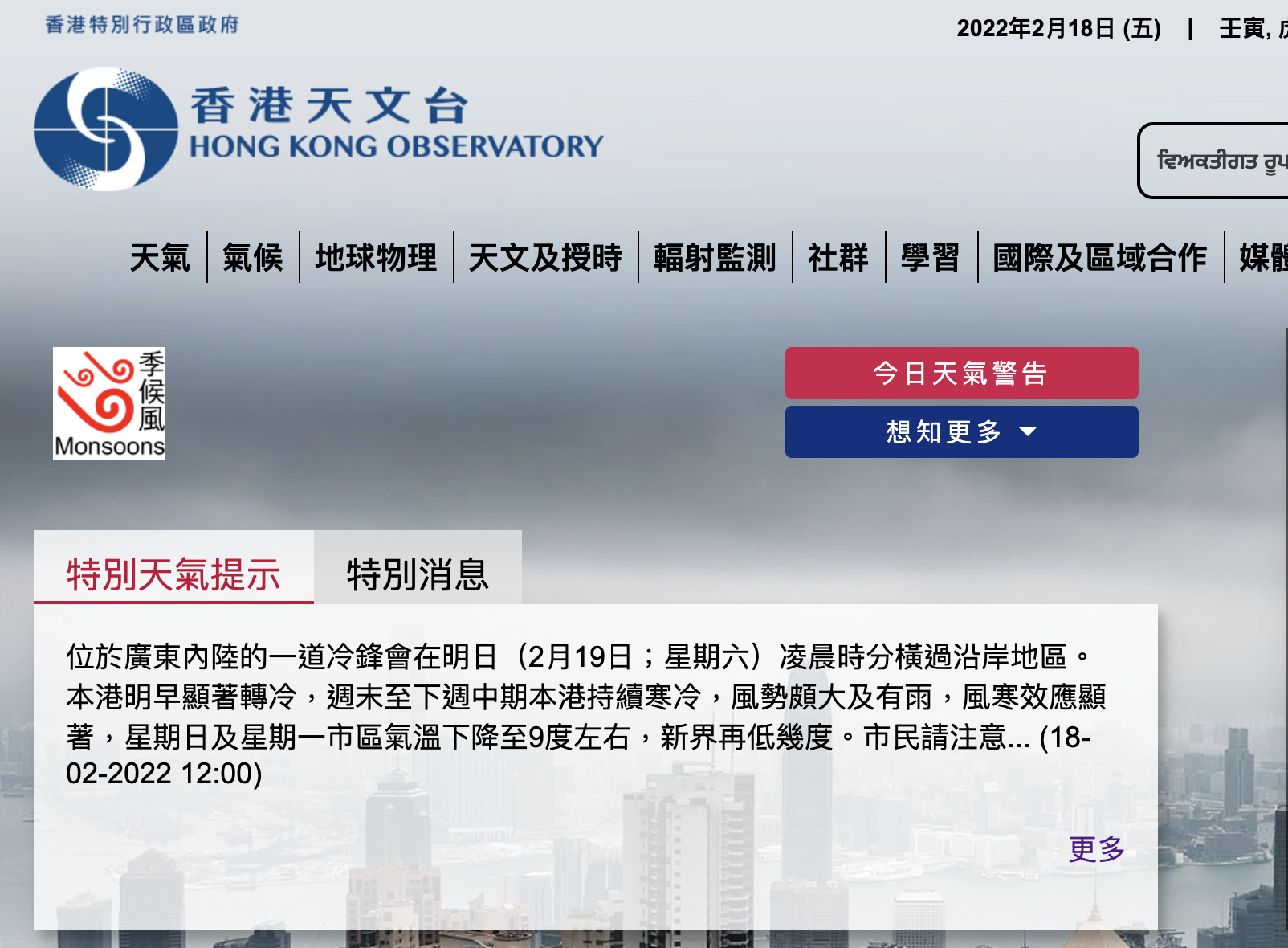 【橙訊】天文台在中午發出特別天氣提示,表示位於廣東內陸的一道冷鋒會在明日凌晨時分橫過沿岸地區。本港明早顯著轉冷,周末至下周中期本港持續寒冷,風勢頗大及有雨,風寒效應顯著,星期日及星期一市區氣溫下降至九度左右,新界再低幾度。市民請注意保暖,並要關顧長者及慢性病患者。