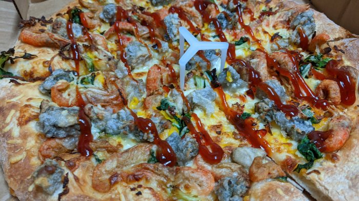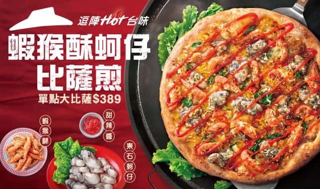 Pizza Hut是次推出的「蝦猴酥蚵仔比薩煎」結合了台灣夜市人氣小食「蚵仔煎」及「蝦猴酥」的特色,於薄餅加入主打份量十足的海鮮配料。薄餅以舊金山手工餅皮配搭台灣嘉義東石鮮蚵及蝦猴酥,加上雞蛋絲、小白菜巴馬臣芝士、水牛芝士及特調甜辣醬等配料而成。