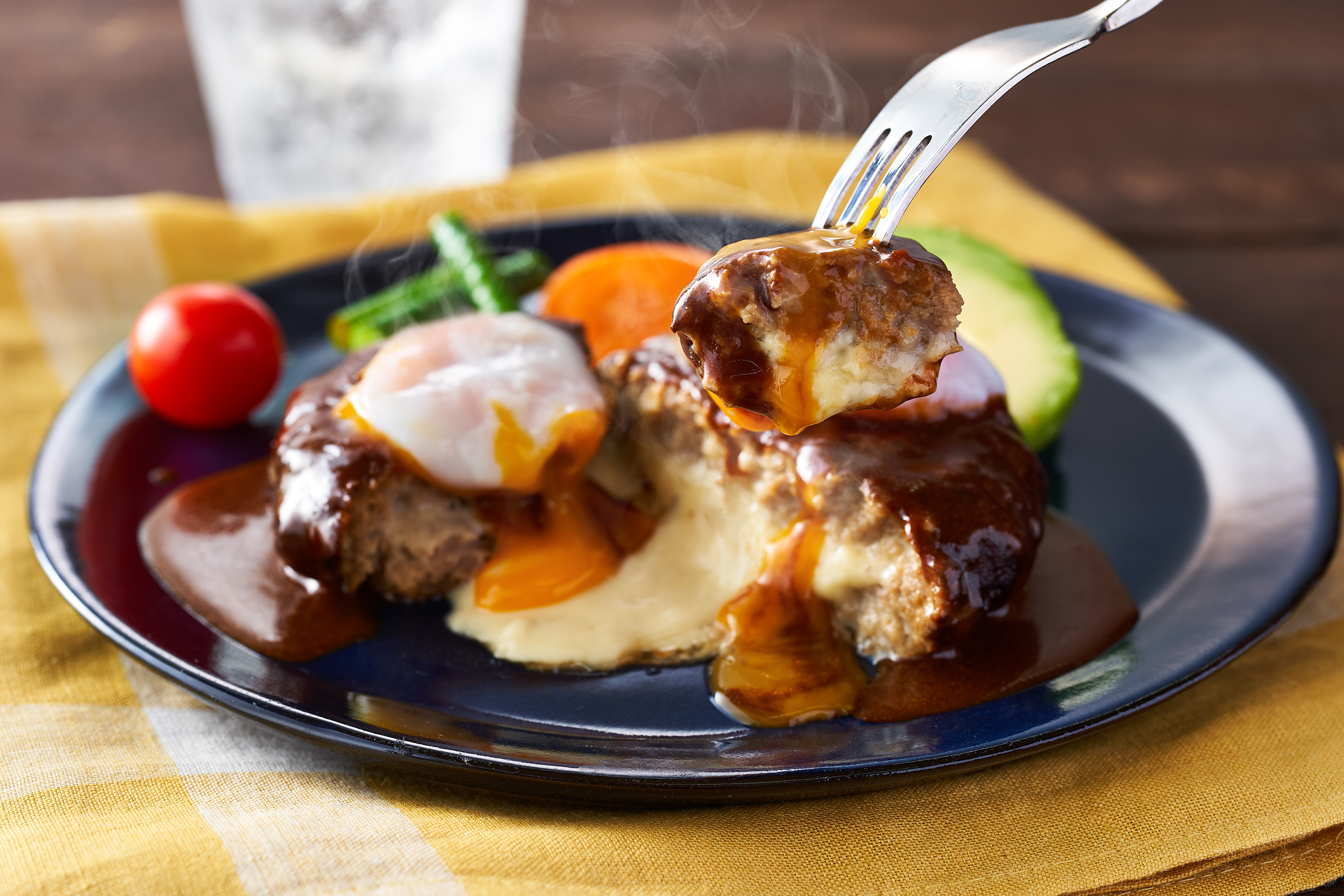 「流心芝士漢堡扒」將牛肉、豚肉及雞肉磨碎成免治肉,配搭兵庫縣淡路島洋蔥及芝士而成
