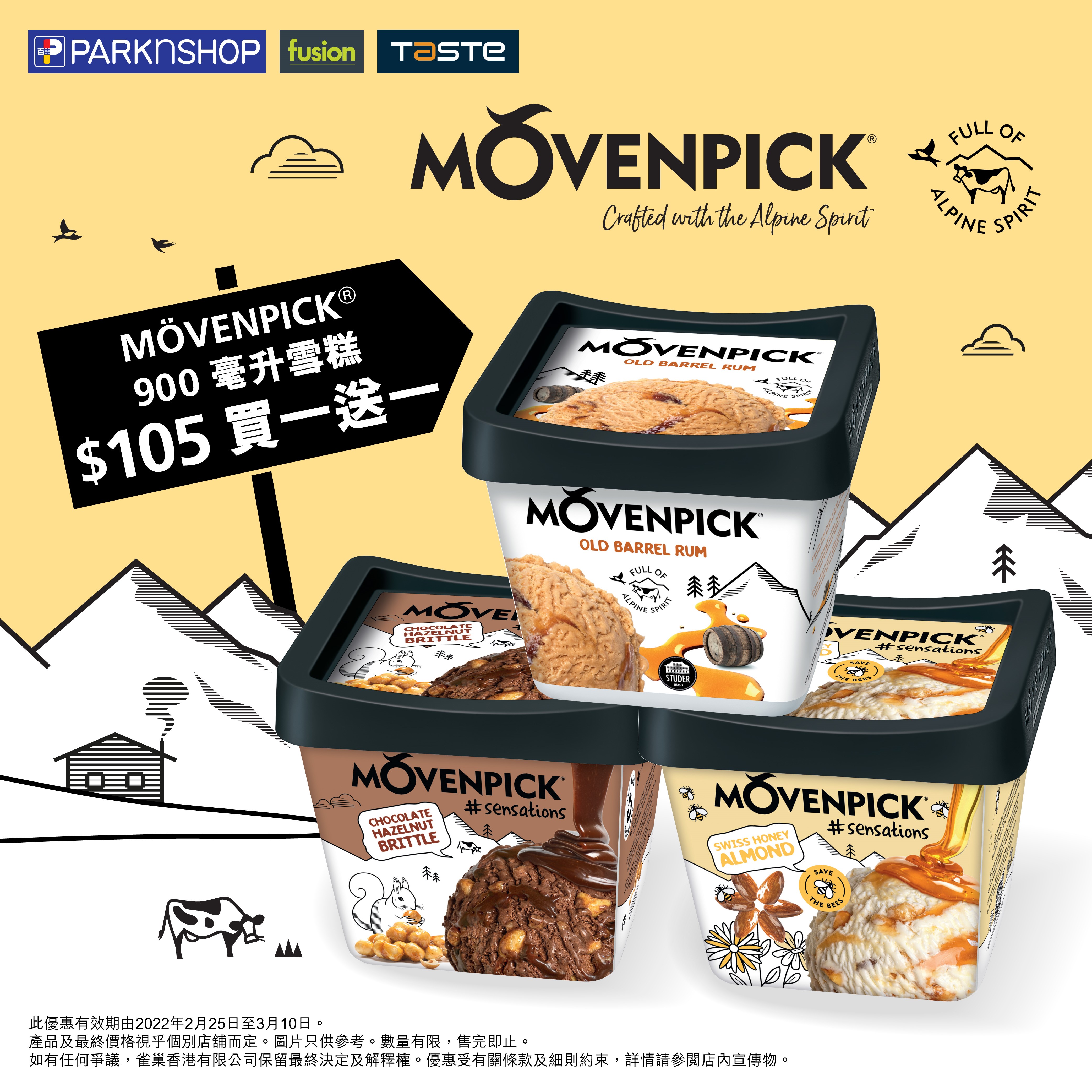 優惠價:$105「陳年木桶冧酒雪糕」、「朱古力榛子碎雪糕」、「瑞士蜂蜜杏仁雪糕」MÖVENPICK®900 毫升家庭裝雪糕買一送一